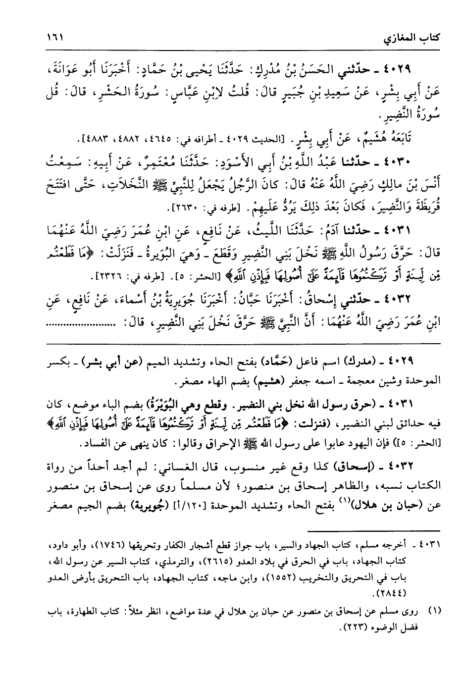 4031 - (حرق رسول الله نخل بني النضير. وقطع وهي البُوَيْرَةُ) بضم الباء موضع، كان فيه حدائق لبني النضير، (فنزلت: {مَا قَطَعْتُمْ مِنْ لِينَةٍ أَوْ تَرَكْتُمُوهَا قَائِمَةً عَلَى أُصُولِهَا فَبِإِذْنِ اللَّهِ} [الحشر: 5] فإن اليهود عابوا على رسول الله - صلى الله عليه وسلم - الإحراق وقالوا: كان ينهى عن الفساد.