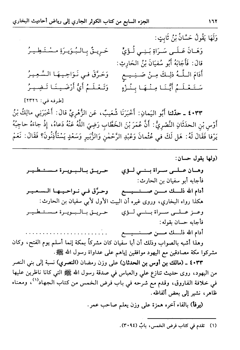 4033 - (مالك بن أوس بن الحدثان) على وزن رمضان (النصري) نسبة إلى بني النصر من اليهود، روى حديث تنازع علي والعباس في صدقة رسول الله - صلى الله عليه وسلم - التي كانا ناظرين عليها في خلافة الفاروق، وقدم مع شرحه في باب فرض الخمس من كتاب الجهاد، ومعناه ظاهر، نشير إلى بعض ألفاظه.