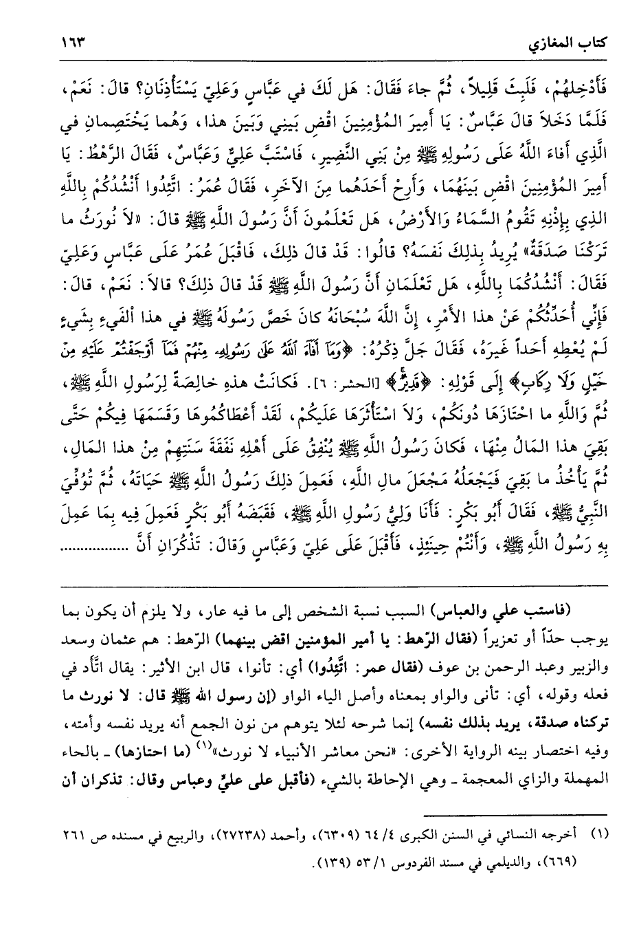 فَأَدْخِلْهُمْ. فَلَبِثَ قَلِيلاً، ثُمَّ جَاءَ فَقَالَ هَلْ لَكَ فِي عَبَّاسٍ وَعَلِىٍّ يَسْتَأْذِنَانِ قَالَ نَعَمْ.، فَأَدْخِلْهُمْ. فَلَبِثَ قَلِيلاً، ثُمَّ جَاءَ فَقَالَ هَلْ لَكَ فِي عَبَّاسٍ وَعَلِىٍّ يَسْتَأْذِنَانِ قَالَ نَعَمْ. فَلَمَّا دَخَلاَ قَالَ عَبَّاسٌ يَا أَمِيرَ الْمُؤْمِنِينَ، اقْضِ بَيْنِى وَبَيْنَ هَذَا، وَهُمَا يَخْتَصِمَانِ فِي الَّذِى أَفَاءَ اللَّهُ عَلَى رَسُولِهِ - صلى الله عليه وسلم - مِنْ بَنِى النَّضِيرِ، فَاسْتَبَّ عَلِىٌّ وَعَبَّاسٌ، فَقَالَ الرَّهْطُ يَا أَمِيرَ الْمُؤْمِنِينَ، اقْضِ بَيْنَهُمَا وَأَرِحْ أَحَدَهُمَا مِنَ الآخَرِ. فَقَالَ عُمَرُ اتَّئِدُوا، أَنْشُدُكُمْ بِاللَّهِ الَّذِى بِإِذْنِهِ تَقُومُ السَّمَاءُ وَالأَرْضُ، هَلْ تَعْلَمُونَ أَنَّ رَسُولَ اللَّهِ - صلى الله عليه وسلم - قَالَ «لاَ نُورَثُ، مَا تَرَكْنَا صَدَقَةٌ». يُرِيدُ بِذَلِكَ نَفْسَهُ. قَالُوا قَدْ قَالَ ذَلِكَ. فَأَقْبَلَ عُمَرُ عَلَى عَبَّاسٍ وَعَلِىٍّ فَقَالَ أَنْشُدُكُمَا بِاللَّهِ هَلْ تَعْلَمَانِ أَنَّ رَسُولَ اللَّهِ - صلى الله عليه وسلم - قَدْ قَالَ ذَلِكَ قَالاَ نَعَمْ. قَالَ فَإِنِّى أُحَدِّثُكُمْ عَنْ هَذَا الأَمْرِ، إِنَّ اللَّهَ سُبْحَانَهُ كَانَ خَصَّ رَسُولَهُ - صلى الله عليه وسلم - فِي هَذَا الْفَىْءِ بِشَىْءٍ لَمْ يُعْطِهِ أَحَدًا غَيْرَهُ فَقَالَ جَلَّ ذِكْرُهُ (وَمَا أَفَاءَ اللَّهُ عَلَى رَسُولِهِ مِنْهُمْ فَمَا أَوْجَفْتُمْ عَلَيْهِ مِنْ خَيْلٍ وَلاَ رِكَابٍ) إِلَى قَوْلِهِ (قَدِيرٌ) فَكَانَتْ هَذِهِ خَالِصَةً لِرَسُولِ اللَّهِ - صلى الله عليه وسلم -، ثُمَّ وَاللَّهِ مَا احْتَازَهَا دُونَكُمْ، وَلاَ اسْتَأْثَرَهَا عَلَيْكُمْ، لَقَدْ أَعْطَاكُمُوهَا وَقَسَمَهَا فِيكُمْ، حَتَّى بَقِىَ هَذَا الْمَالُ مِنْهَا، فَكَانَ رَسُولُ اللَّهِ - صلى الله عليه وسلم - يُنْفِقُ عَلَى أَهْلِهِ نَفَقَةَ سَنَتِهِمْ مِنْ هَذَا الْمَالِ، ثُمَّ يَأْخُذُ مَا بَقِىَ فَيَجْعَلُهُ مَجْعَلَ مَالِ اللَّهِ، فَعَمِلَ ذَلِكَ رَسُولُ اللَّهِ - صلى الله عليه وسلم - حَيَاتَهُ، ثُمَّ تُوُفِّىَ النَّبِىُّ - صلى الله عليه وسلم - فَقَالَ أَبُو بَكْرٍ فَأَنَا وَلِىُّ رَسُولِ اللَّهِ - صلى الله عليه وسلم -. فَقَبَضَهُ أَبُو بَكْرٍ، فَعَمِلَ فِيهِ بِمَا عَمِلَ بِهِ رَسُولُ اللَّهِ - صلى الله عليه وسلم - وَأَنْتُمْ حِينَئِذٍ. فَأَقْبَلَ عَلَى عَلِىٍّ وَعَبَّاسٍ وَقَالَ تَذْكُرَانِ أَنَّ