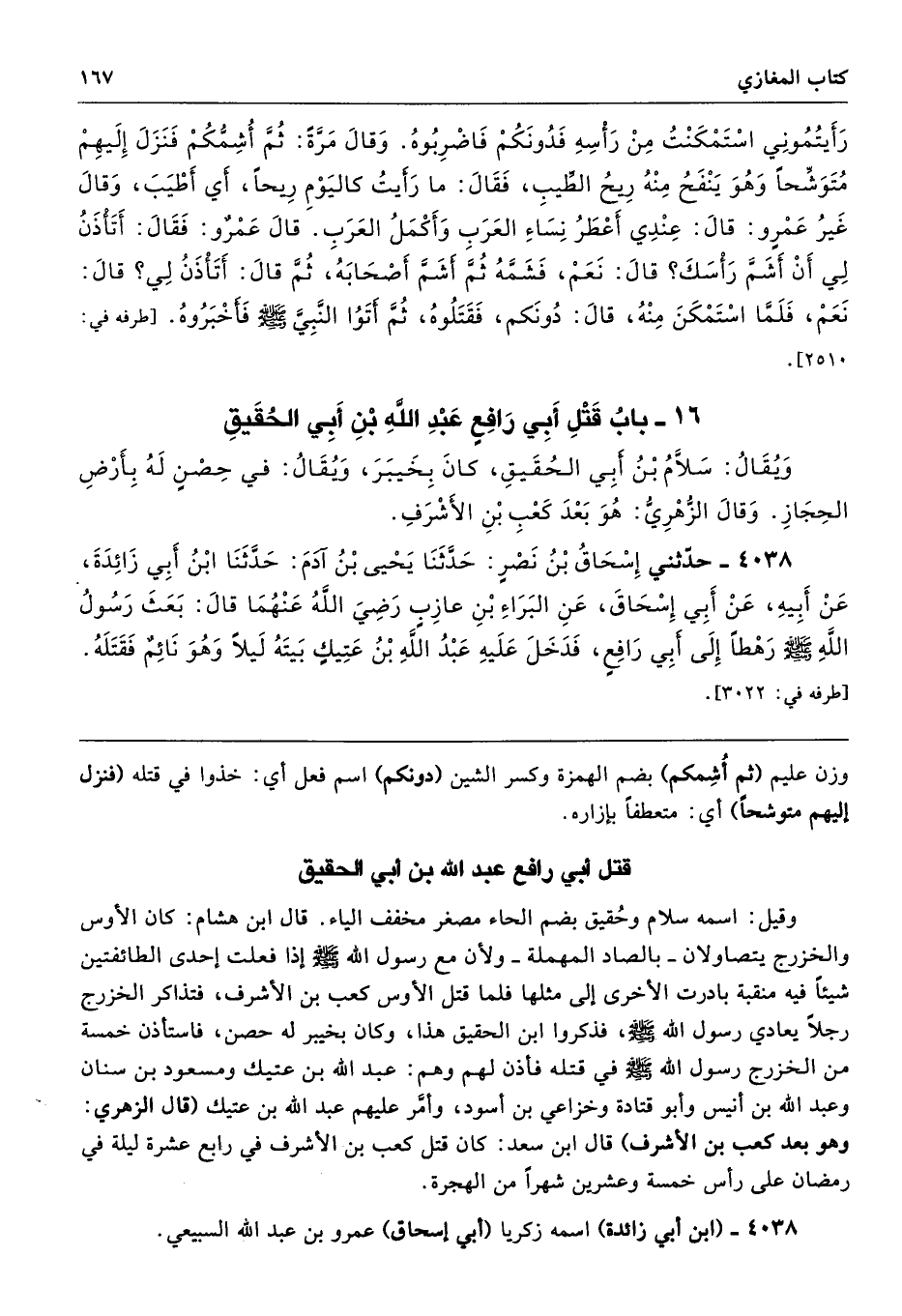 4038 - حَدَّثَنِى إِسْحَاقُ بْنُ نَصْرٍ حَدَّثَنَا يَحْيَى بْنُ آدَمَ حَدَّثَنَا ابْنُ أَبِى زَائِدَةَ عَنْ أَبِيهِ عَنْ أَبِى إِسْحَاقَ عَنِ الْبَرَاءِ بْنِ عَازِبٍ - رضى الله عنهما - قَالَ بَعَثَ رَسُولُ اللَّهِ - صلى الله عليه وسلم - رَهْطًا إِلَى أَبِى رَافِعٍ فَدَخَلَ عَلَيْهِ عَبْدُ اللَّهِ بْنُ عَتِيكٍ بَيْتَهُ لَيْلاً وَهْوَ نَائِمٌ فَقَتَلَهُ. طرفه 3022