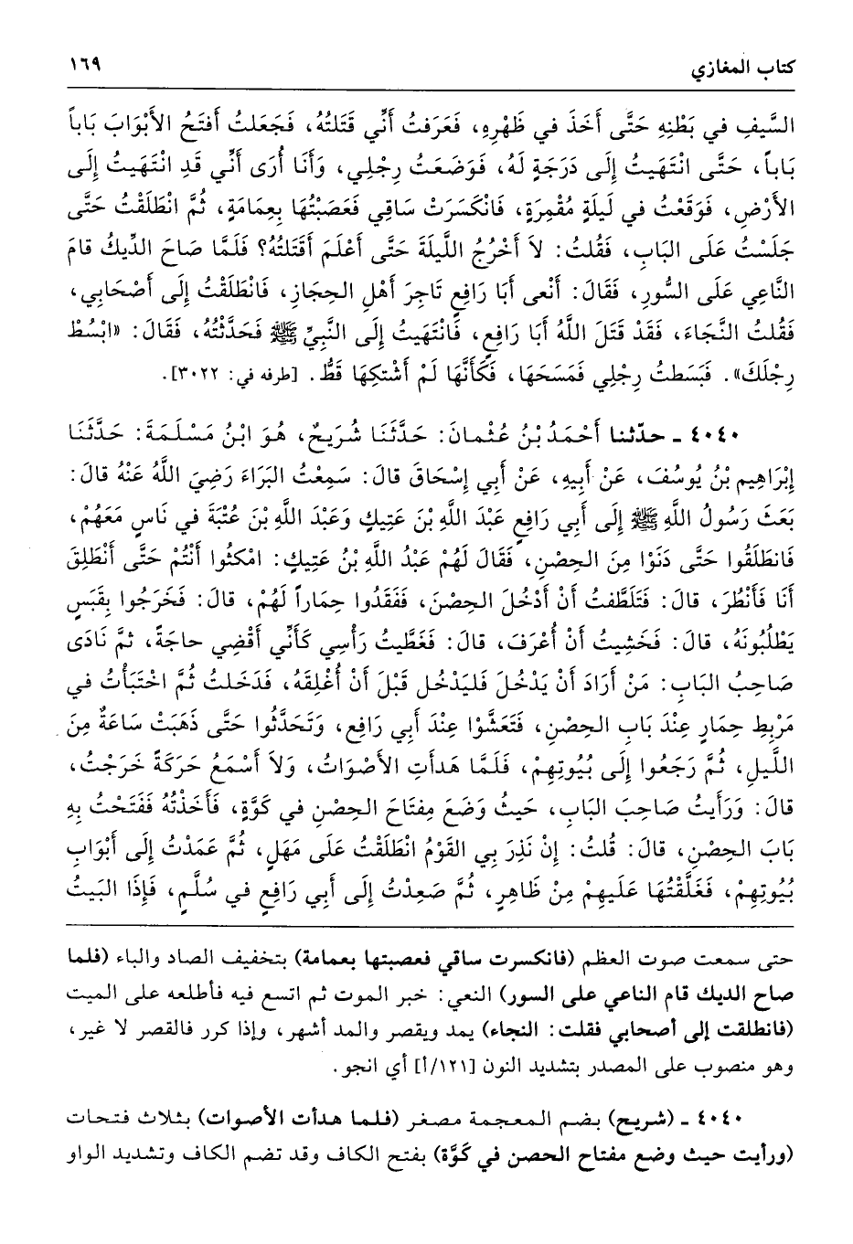 السَّيْفِ فِي بَطْنِهِ حَتَّى أَخَذَ فِي ظَهْرِهِ، فَعَرَفْتُ أَنِّى قَتَلْتُهُ، فَجَعَلْتُ أَفْتَحُ الأَبْوَابَ بَابًا بَابًا حَتَّى انْتَهَيْتُ إِلَى دَرَجَةٍ لَهُ، فَوَضَعْتُ رِجْلِى وَأَنَا أُرَى أَنِّى قَدِ انْتَهَيْتُ إِلَى الأَرْضِ فَوَقَعْتُ فِي لَيْلَةٍ مُقْمِرَةٍ، فَانْكَسَرَتْ سَاقِى، فَعَصَبْتُهَا بِعِمَامَةٍ، ثُمَّ انْطَلَقْتُ حَتَّى جَلَسْتُ عَلَى الْبَابِ فَقُلْتُ لاَ أَخْرُجُ اللَّيْلَةَ حَتَّى أَعْلَمَ أَقَتَلْتُهُ فَلَمَّا صَاحَ الدِّيكُ قَامَ النَّاعِى عَلَى السُّورِ فَقَالَ أَنْعَى أَبَا رَافِعٍ تَاجِرَ أَهْلِ الْحِجَازِ. فَانْطَلَقْتُ إِلَى أَصْحَابِى فَقُلْتُ النَّجَاءَ، فَقَدْ قَتَلَ اللَّهُ أَبَا رَافِعٍ. فَانْتَهَيْتُ إِلَى النَّبِيِّ - صلى الله عليه وسلم - فَحَدَّثْتُهُ فَقَالَ «ابْسُطْ رِجْلَكَ». فَبَسَطْتُ رِجْلِى، فَمَسَحَهَا، فَكَأَنَّهَا لَمْ أَشْتَكِهَا قَطُّ. طرفه 3022