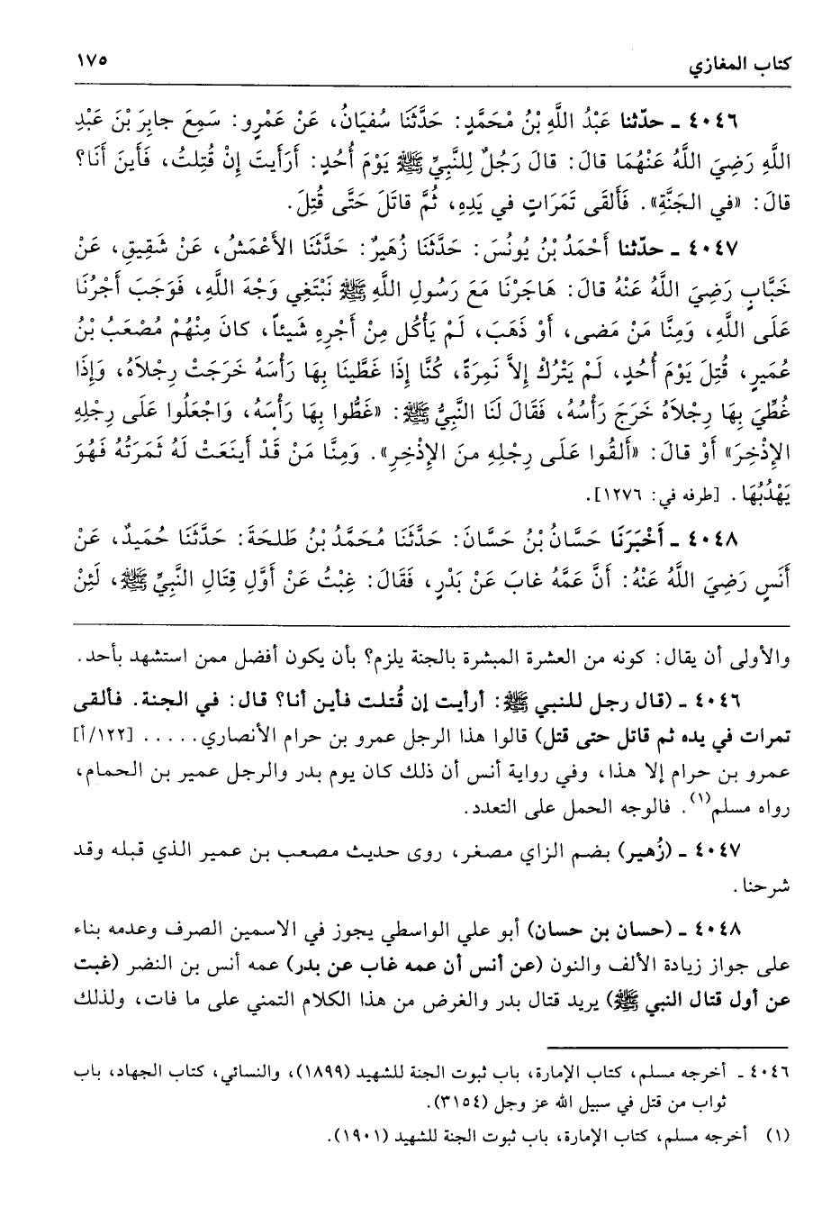 4046 - (قال رجل للنبي - صلى الله عليه وسلم -: أرأيت إن قُتلت فأين أنا؟ قال: في الجنَّة. فألقى تمرات في يده ثم قاتل حتَّى قتل) قالوا هذا الرجل عمرو بن حرام الأنصاري ..... عمرو بن حرام إلا هذا، وفي رواية أنس أن ذلك كان يوم بدر والرجل عمير بن الحمام، رواه مسلم. فالوجه الحمل على التعدد.