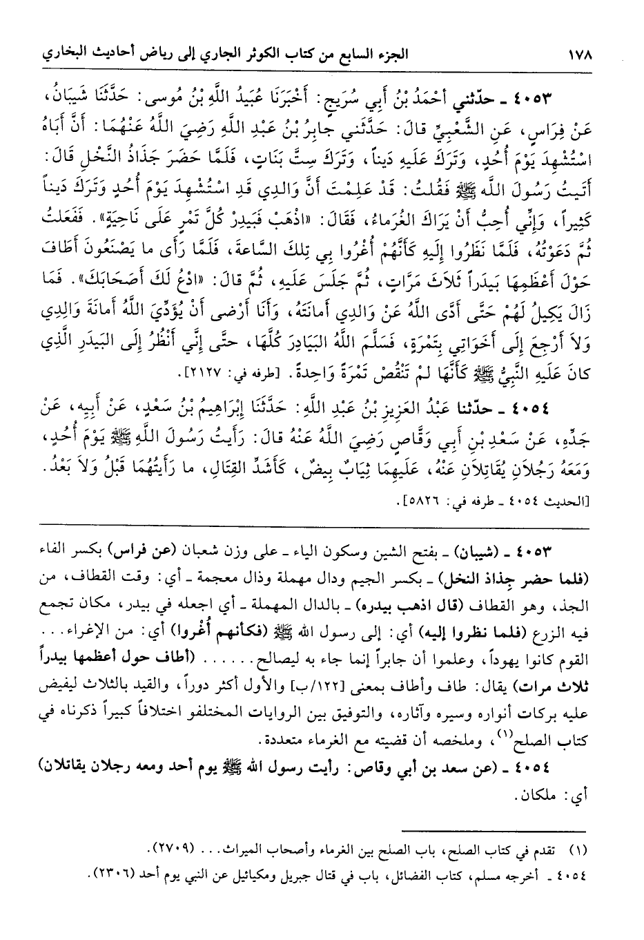 4053 - (شيبان) -بفتح الشين وسكون الياء- على وزن شعبان (عن فراس) بكسر الفاء (فلما حضر جِذاذ النخل) -بكسر الجيم وداله مهملة وذال معجمة- أي: وقت القطاف، من الجذ، وهو القطاف (قال اذهب بيدره) -بالدال المهملة- أي اجعله في بيدر، مكان تجمع فيه الزرع (فلما انظروا إليه) أي: إلى رسول الله - صلى الله عليه وسلم - (فكأنهم أُغْروا) أي: من الإغراء ... القوم كانوا يهودًا، وعلموا أن جابرًا إنما جاء به ليصالح ...... (أطاف حول أعظمها بيدرًا ثلاث مرات) يقال: طاف وأطاف بمعنى والأول أكثر دورًا، والقيد بالثلاث ليفيض عليه بركات أنواره وسيره وآثاره، والتوفيق بين الروايات المختلفة اختلافًا كبيرًا ذكرناه في كتاب الصلح، وملخصه أن قضيته مع الغرماء متعددة.