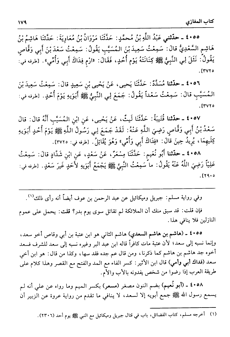 4058 - (أبو نُعيم) بضم النون مصغر (مسعر) بكسر الميم وما رواه عن علي أنَّه لم يسمع رسول الله - صلى الله عليه وسلم - جمع أبويه إلا لسعد، لا ينافي ما تقدم من رواية عروة عن الزبير أن