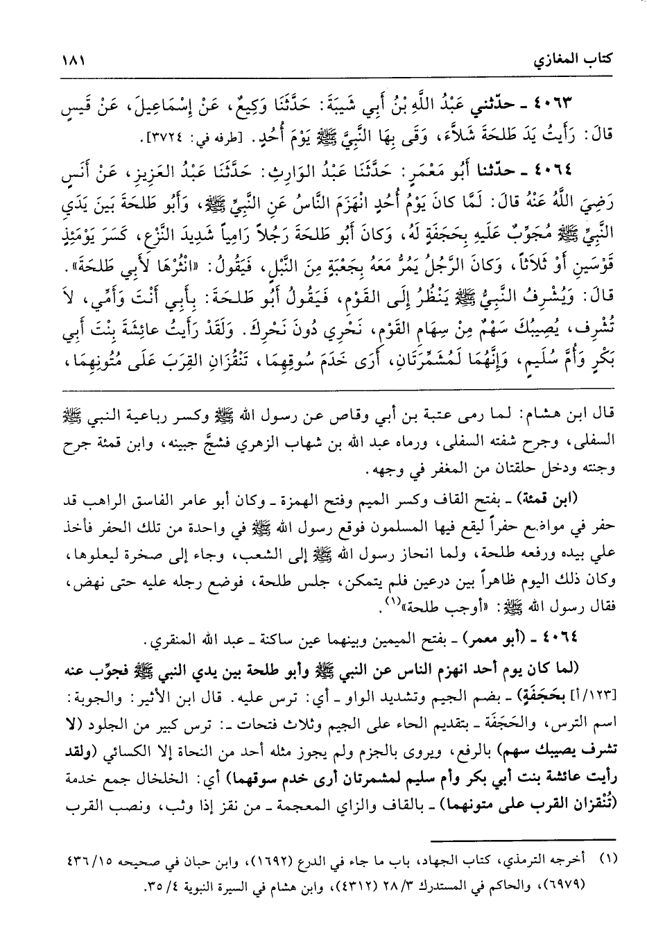 (لما كان يوم أحد انهزم الناس عن النبي - صلى الله عليه وسلم - وأبو طلحة بين يدي النبي - صلى الله عليه وسلم - فجوِّب عنه بحَجَفَةٍ) -بضم الجيم وتشديد الواو- أي: ترس عليه. قالا ابن الأثير: والجوبة: اسم الترس، والحَجَفَة -بتقديم الحاء على الجيم وثلاث فتحات-: ترس كبير من الجلود (لا تشرف يصيبك سهم) بالرفع، ويروى بالجزم ولم يجوز مثله أحد من النحاة إلا الكسائي (ولقد رأيت عائشة بنت أبي بكر وأم سليم لمشمرتان أرى خدم سوقهما) أي: الخلخال جمع خدمة (تُنْقزان القرب على متونهما) -بالقاف والزاي المعجمة- من نقز إذا وثب، ونصب القرب