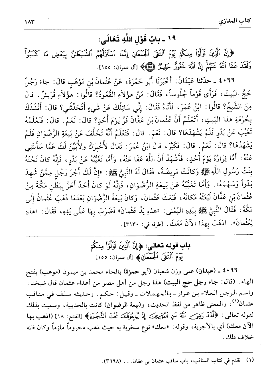4066 - حَدَّثَنَا عَبْدَانُ أَخْبَرَنَا أَبُو حَمْزَةَ عَنْ عُثْمَانَ بْنِ مَوْهَبٍ قَالَ جَاءَ رَجُلٌ حَجَّ الْبَيْتَ فَرَأَى قَوْمًا جُلُوسًا فَقَالَ مَنْ هَؤُلاَءِ الْقُعُودُ قَالُوا هَؤُلاَءِ قُرَيْشٌ. قَالَ مَنِ الشَّيْخُ قَالُوا ابْنُ عُمَرَ. فَأَتَاهُ فَقَالَ إِنِّى سَائِلُكَ عَنْ شَىْءٍ أَتُحَدِّثُنِى، قَالَ أَنْشُدُكَ بِحُرْمَةِ هَذَا الْبَيْتِ أَتَعْلَمُ أَنَّ عُثْمَانَ بْنَ عَفَّانَ فَرَّ يَوْمَ أُحُدٍ قَالَ نَعَمْ. قَالَ فَتَعْلَمُهُ تَغَيَّبَ عَنْ بَدْرٍ فَلَمْ يَشْهَدْهَا قَالَ نَعَمْ. قَالَ فَتَعْلَمُ أَنَّهُ تَخَلَّفَ عَنْ بَيْعَةِ الرُّضْوَانِ فَلَمْ يَشْهَدْهَا قَالَ نَعَمْ. قَالَ فَكَبَّرَ. قَالَ ابْنُ عُمَرَ تَعَالَ لأُخْبِرَكَ وَلأُبَيِّنَ لَكَ عَمَّا سَأَلْتَنِى عَنْهُ، أَمَّا فِرَارُهُ يَوْمَ أُحُدٍ فَأَشْهَدُ أَنَّ اللَّهَ عَفَا عَنْهُ، وَأَمَّا تَغَيُّبُهُ عَنْ بَدْرٍ فَإِنَّهُ كَانَ تَحْتَهُ بِنْتُ رَسُولِ اللَّهِ - صلى الله عليه وسلم - وَكَانَتْ مَرِيضَةً، فَقَالَ لَهُ النَّبِىُّ - صلى الله عليه وسلم - «إِنَّ لَكَ أَجْرَ رَجُلٍ مِمَّنْ شَهِدَ بَدْرًا وَسَهْمَهُ». وَأَمَّا تَغَيُّبُهُ عَنْ بَيْعَةِ الرُّضْوَانِ فَإِنَّهُ لَوْ كَانَ أَحَدٌ أَعَزَّ بِبَطْنِ مَكَّةَ مِنْ عُثْمَانَ بْنِ عَفَّانَ لَبَعَثَهُ مَكَانَهُ، فَبَعَثَ عُثْمَانَ، وَكَانَ بَيْعَةُ الرُّضْوَانِ بَعْدَ مَا ذَهَبَ عُثْمَانُ إِلَى مَكَّةَ فَقَالَ النَّبِىُّ - صلى الله عليه وسلم - بِيَدِهِ الْيُمْنَى «هَذِهِ يَدُ عُثْمَانَ». فَضَرَبَ بِهَا عَلَى يَدِهِ فَقَالَ «هَذِهِ لِعُثْمَانَ». اذْهَبْ بِهَذَا الآنَ مَعَكَ. طرفه 3130