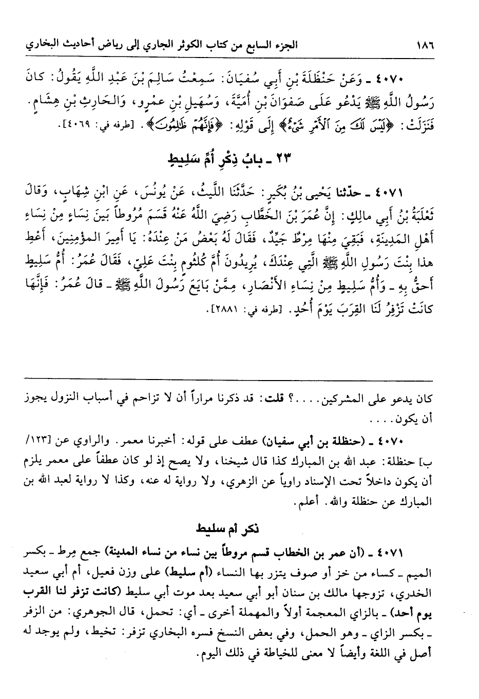 4071 - (أن عمر بن الخطاب قسم مروطًا بين نساء من نساء المدينة) جمع مِرط -بكسر الميم- كساء من خز أو صوف يتزر بها النساء (أم سليط) على وزن فعيل، أم أبي سعيد الخدري، تزوجها مالك بن سنان أبو أبي سعيد بعد موت أبي سليط (كانت تزفر لنا القرب يوم أحد) -بالزاي المعجمة أولًا والمهملة أخرى- أي: تحمل، قال الجوهري: من الزفر -بكسر الزاي- وهو الحمل، وفي بعض النسخ فسره البخاري تزفر: تخيط، ولم يوجد له أصل في اللغة وأيضًا لا معنى للخياطة في ذلك اليوم.
