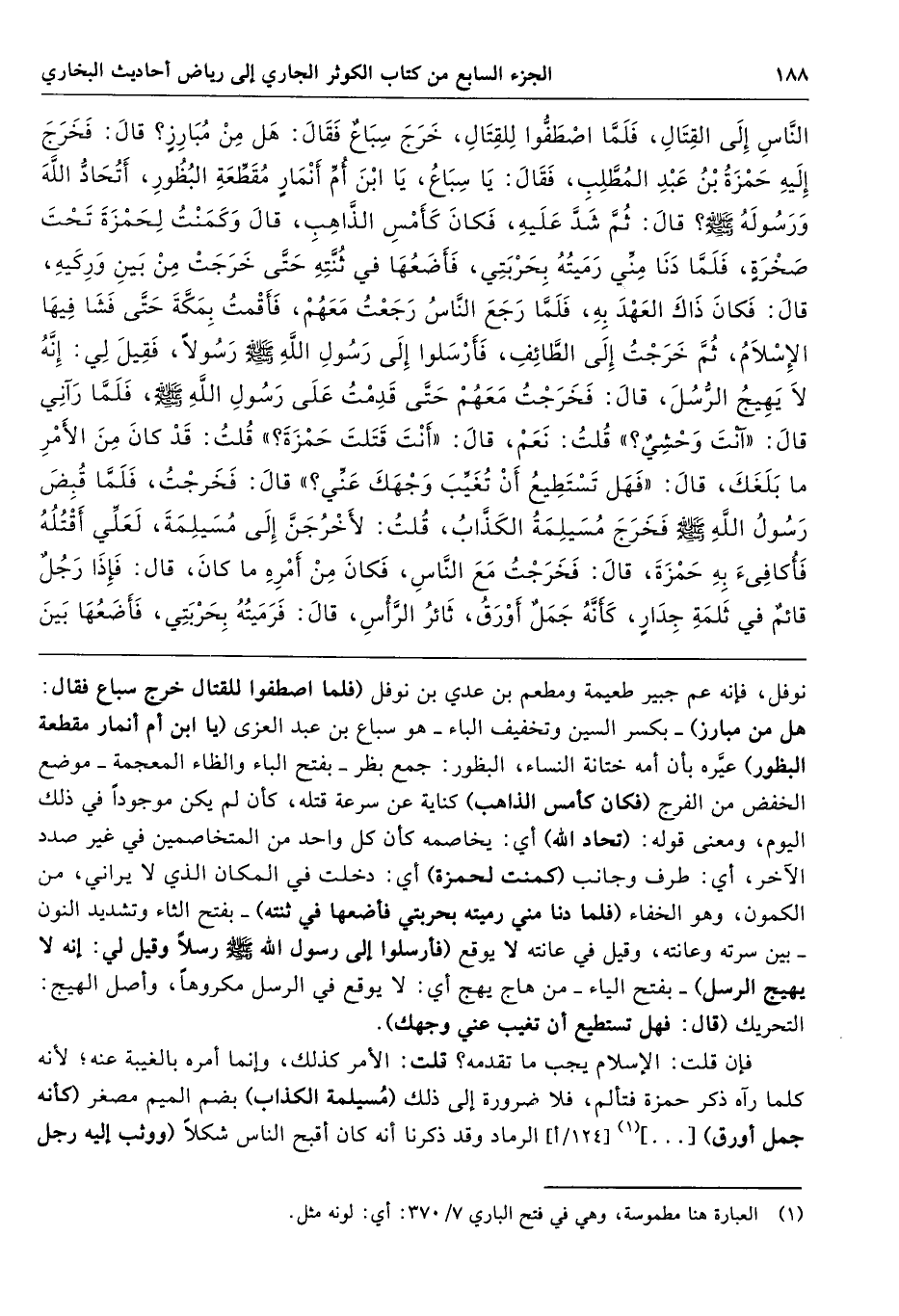 نوفل، فإنه عم جبير طعيمة ومطعم بن عدي بن نوفل (فلما اصطفوا للقتال خرج سباع فقال: هل من مبارز) -بكسر السين وتخفيف الباء- هو سباع بن عبد العزى (يا ابن أم أنمار مقطعة البظور) عيَّره بأن أمه ختانة النساء، البظور: جمع بظر -بفتح الباء والظاء المعجمة- موضع الخفض من الفرج (فكان كأمس الذاهب) كناية عن سرعة قتله، كأن لم يكن موجودًا في ذلك اليوم، ومعنى قوله: (تحاد الله) أي: يخاصمه كأن كل واحد من المتخاصمين في غير صدد الآخر، أي: طرف وجانب (كمنت لحمزة) أي: دخلت في المكان الَّذي لا يراني، من الكمون، وهو الخفاء (فلما دنا مني رميته بحربتي فأضعها في ثنته) -بفتح الثاء وتشديد النون- بين سرته وعانته، وقيل في عانته لا يوقع (فأرسلوا إلى رسول الله - صلى الله عليه وسلم - رسلًا وقيل لي: إنه لا يهيج الرسل) -بفتح الياء- من هاج يهج أي: لا يوقع في الرسل مكروهًا، وأصل الهيج: التحريك (قال: فهل تستطيع أن تغيب عني وجهك).