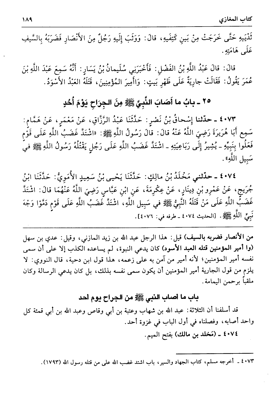 4074 - حَدَّثَنِى مَخْلَدُ بْنُ مَالِكٍ حَدَّثَنَا يَحْيَى بْنُ سَعِيدٍ الأُمَوِىُّ حَدَّثَنَا ابْنُ جُرَيْجٍ عَنْ عَمْرِو بْنِ دِينَارٍ عَنْ عِكْرِمَةَ عَنِ ابْنِ عَبَّاسٍ - رضى الله عنهما - قَالَ اشْتَدَّ غَضَبُ اللَّهِ عَلَى مَنْ قَتَلَهُ النَّبِىُّ - صلى الله عليه وسلم - فِي سَبِيلِ اللَّهِ، اشْتَدَّ غَضَبُ اللَّهِ عَلَى قَوْمٍ دَمَّوْا وَجْهَ نَبِىِّ اللَّهِ - صلى الله عليه وسلم -. طرفه 4076