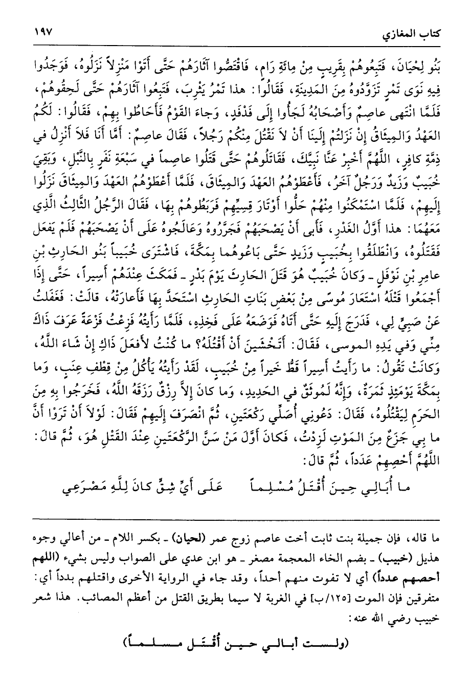بَنُو لَحْيَانَ، فَتَبِعُوهُمْ بِقَرِيبٍ مِنْ مِائَةِ رَامٍ، فَاقْتَصُّوا آثَارَهُمْ حَتَّى أَتَوْا مَنْزِلاً نَزَلُوهُ فَوَجَدُوا فِيهِ نَوَى تَمْرٍ تَزَوَّدُوهُ مِنَ الْمَدِينَةِ فَقَالُوا هَذَا تَمْرُ يَثْرِبَ. فَتَبِعُوا آثَارَهُمْ حَتَّى لَحِقُوهُمْ، فَلَمَّا انْتَهَى عَاصِمٌ وَأَصْحَابُهُ لَجَئُوا إِلَى فَدْفَدٍ، وَجَاءَ الْقَوْمُ فَأَحَاطُوا بِهِمْ، فَقَالُوا لَكُمُ الْعَهْدُ وَالْمِيثَاقُ إِنْ نَزَلْتُمْ إِلَيْنَا أَنْ لاَ نَقْتُلَ مِنْكُمْ رَجُلاً. فَقَالَ عَاصِمٌ أَمَّا أَنَا فَلاَ أَنْزِلُ فِي ذِمَّةِ كَافِرٍ، اللَّهُمَّ أَخْبِرْ عَنَّا نَبِيَّكَ. فَقَاتَلُوهُمْ حَتَّى قَتَلُوا عَاصِمًا فِي سَبْعَةِ نَفَرٍ بِالنَّبْلِ، وَبَقِىَ خُبَيْبٌ، وَزَيْدٌ وَرَجُلٌ آخَرُ، فَأَعْطَوْهُمُ الْعَهْدَ وَالْمِيثَاقَ، فَلَمَّا أَعْطَوْهُمُ الْعَهْدَ وَالْمِيثَاقَ نَزَلُوا إِلَيْهِمْ، فَلَمَّا اسْتَمْكَنُوا مِنْهُمْ حَلُّوا أَوْتَارَ قِسِيِّهِمْ فَرَبَطُوهُمْ بِهَا. فَقَالَ الرَّجُلُ الثَّالِثُ الَّذِى مَعَهُمَا هَذَا أَوَّلُ الْغَدْرِ. فَأَبَى أَنْ يَصْحَبَهُمْ فَجَرَّرُوهُ وَعَالَجُوهُ عَلَى أَنْ يَصْحَبَهُمْ، فَلَمْ يَفْعَلْ، فَقَتَلُوهُ، وَانْطَلَقُوا بِخُبَيْبٍ وَزَيْدٍ حَتَّى بَاعُوهُمَا بِمَكَّةَ، فَاشْتَرَى خُبَيْبًا بَنُو الْحَارِثِ بْنِ عَامِرِ بْنِ نَوْفَلٍ، وَكَانَ خُبَيْبٌ هُوَ قَتَلَ الْحَارِثَ يَوْمَ بَدْرٍ، فَمَكَثَ عِنْدَهُمْ أَسِيرًا حَتَّى إِذَا أَجْمَعُوا قَتْلَهُ اسْتَعَارَ مُوسَى مِنْ بَعْضِ بَنَاتِ الْحَارِثِ أَسْتَحِدَّ بِهَا فَأَعَارَتْهُ، قَالَتْ فَغَفَلْتُ عَنْ صَبِىٍّ لِى فَدَرَجَ إِلَيْهِ حَتَّى أَتَاهُ، فَوَضَعَهُ عَلَى فَخِذِهِ، فَلَمَّا رَأَيْتُهُ فَزِعْتُ فَزْعَةً عَرَفَ ذَاكَ مِنِّى، وَفِى يَدِهِ الْمُوسَى فَقَالَ أَتَخْشَيْنَ أَنْ أَقْتُلَهُ مَا كُنْتُ لأَفْعَلَ ذَاكِ إِنْ شَاءَ اللَّهُ. وَكَانَتْ تَقُولُ مَا رَأَيْتُ أَسِيرًا قَطُّ خَيْرًا مِنْ خُبَيْبٍ، لَقَدْ رَأَيْتُهُ يَأْكُلُ مِنْ قِطْفِ عِنَبٍ، وَمَا بِمَكَّةَ يَوْمَئِذٍ ثَمَرَةٌ، وَإِنَّهُ لَمُوثَقٌ فِي الْحَدِيدِ، وَمَا كَانَ إِلاَّ رِزْقٌ رَزَقَهُ اللَّهُ، فَخَرَجُوا بِهِ مِنَ الْحَرَمِ، لِيَقْتُلُوهُ فَقَالَ دَعُونِى أُصَلِّى رَكْعَتَيْنِ. ثُمَّ انْصَرَفَ إِلَيْهِمْ فَقَالَ لَوْلاَ أَنْ تَرَوْا أَنَّ مَا بِى جَزَعٌ مِنَ الْمَوْتِ، لَزِدْتُ. فَكَانَ أَوَّلَ مَنْ سَنَّ الرَّكْعَتَيْنِ عِنْدَ الْقَتْلِ هُوَ، ثُمَّ قَالَ اللَّهُمَّ أَحْصِهِمْ عَدَدًا ثُمَّ قَالَ: