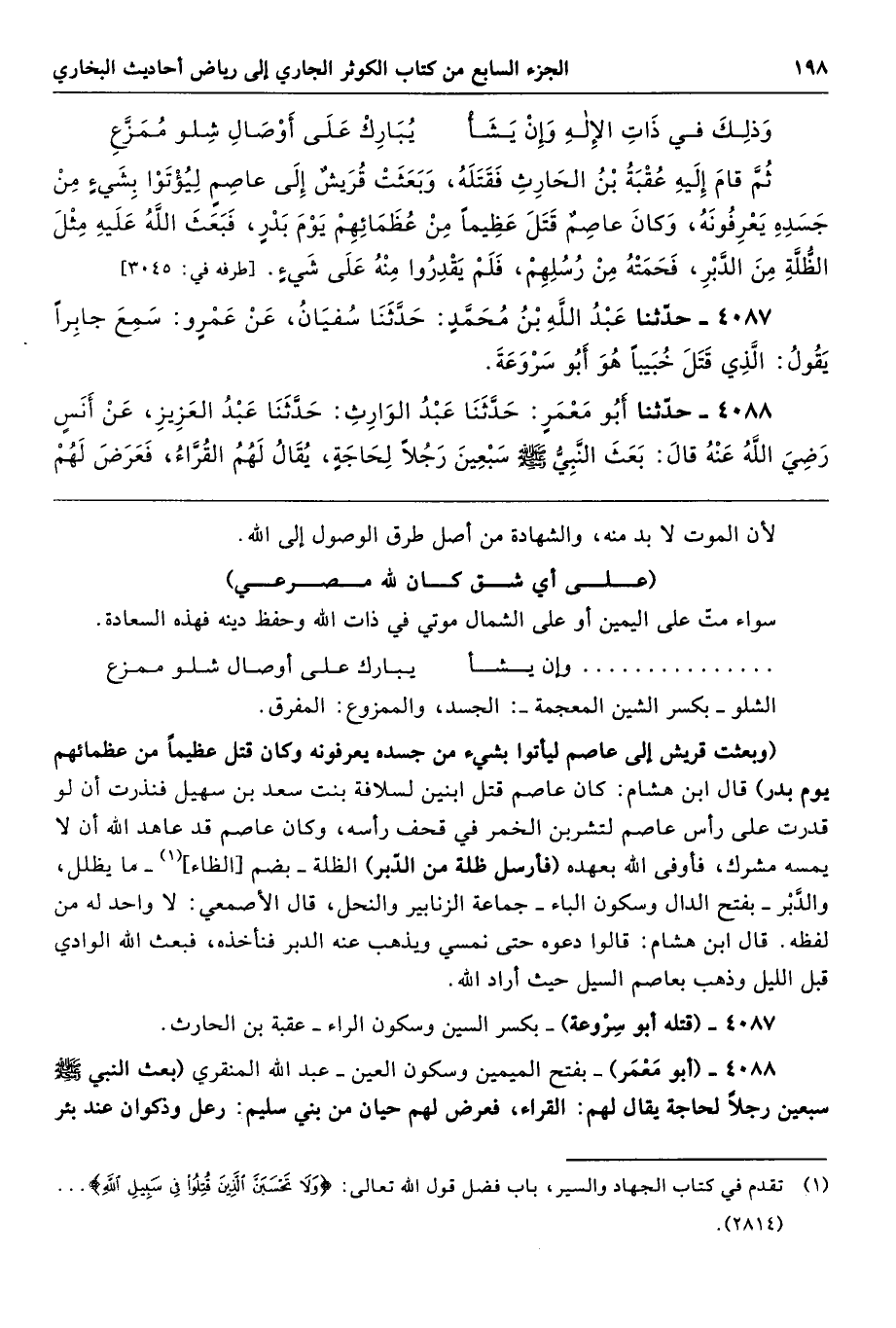 (وبعثت قريش إلى عاصم ليأتوا بشيء من جسده يعرفونه وكان قتل عظيمًا من عظمائهم يوم بدر) قال ابن هشام: كان عاصم قتل ابنين لسلافة بنت سعد بن سهيل فنذرت أن لو قدرت على رأس عاصم لتشربن الخمر في قحف رأسه، وكان عاصم قد عاهد الله أن لا يمسه مشرك، فأوفى الله بعهده (فأرسل ظلة من الدَّبر) الظلة -بضم [الظاء]- ما يظلل، والدَّبْر -بفتح الدال وسكون الباء- جماعة الزنابير والنحل، قال الأصمعي: لا واحد له من لفظه. قال ابن هشام: قالوا دعوه حتَّى نمسي ويذهب عنه الدبر فنأخذه، فبعث الله الوادي قبل الليل وذهب بعاصم السيل حيث أراد الله.