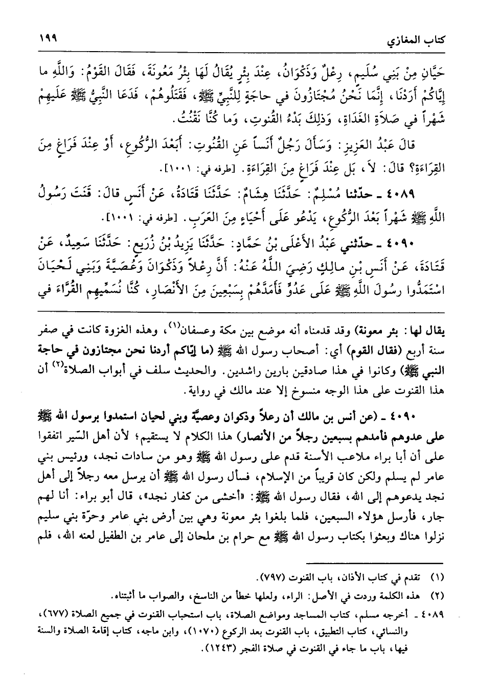 4090 - (عن أنس بن مالك أن رعلًا وذكوان وعصيَّة وبني لحيان استمدوا برسول الله - صلى الله عليه وسلم - على عدوهم فأمدهم بسبعين رجلًا من الأنصار) هذا الكلام لا يستقيم؛ لأن أهل السِّير اتفقوا على أن أبا براء ملاعب الأسنة قدم على رسول الله - صلى الله عليه وسلم - وهو من سادات نجد، ورئيس بني عامر لم يسلم ولكن كان قريبًا من الإسلام، فسأل رسول الله - صلى الله عليه وسلم - أن يرسل معه رجلًا إلى أهل نجد يدعوهم إلى الله، فقال رسول الله - صلى الله عليه وسلم -: "أخشى من كفار نجد"، قال أبو براء: أنا لهم جار، فأرسل هؤلاء السبعين، فلما بلغوا بئر معونة وهي بين أرض بني عامر وحرَّة بني سليم نزلوا هناك وبعثوا بكتاب رسول الله - صلى الله عليه وسلم - مع حرام بن ملحان إلى عامر بن الطفيل لعنه الله، فلم