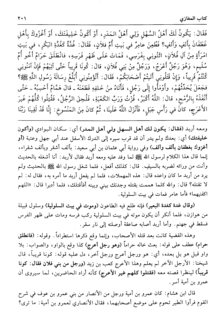 فَقَالَ يَكُونُ لَكَ أَهْلُ السَّهْلِ، وَلِى أَهْلُ الْمَدَرِ، أَوْ أَكُونُ خَلِيفَتَكَ، أَوْ أَغْزُوكَ بِأَهْلِ غَطَفَانَ بِأَلْفٍ وَأَلْفٍ، فَطُعِنَ عَامِرٌ فِي بَيْتِ أُمِّ فُلاَنٍ فَقَالَ غُدَّةٌ كَغُدَّةِ الْبَكْرِ فِي بَيْتِ امْرَأَةٍ مِنْ آلِ فُلاَنٍ ائْتُونِى بِفَرَسِى. فَمَاتَ عَلَى ظَهْرِ فَرَسِهِ، فَانْطَلَقَ حَرَامٌ أَخُو أُمِّ سُلَيْمٍ هُوَ {وَ} رَجُلٌ أَعْرَجُ وَرَجُلٌ مِنْ بَنِى فُلاَنٍ قَالَ كُونَا قَرِيبًا حَتَّى آتِيَهُمْ، فَإِنْ آمَنُونِى كُنْتُمْ، وَإِنْ قَتَلُونِى أَتَيْتُمْ أَصْحَابَكُمْ. فَقَالَ أَتُؤْمِنُونِى أُبَلِّغْ رِسَالَةَ رَسُولِ اللَّهِ - صلى الله عليه وسلم -. فَجَعَلَ يُحَدِّثُهُمْ وَأَوْمَئُوا إِلَى رَجُلٍ، فَأَتَاهُ مِنْ خَلْفِهِ فَطَعَنَهُ - قَالَ هَمَّامٌ أَحْسِبُهُ حَتَّى أَنْفَذَهُ - بِالرُّمْحِ، قَالَ اللَّهُ أَكْبَرُ فُزْتُ وَرَبِّ الْكَعْبَةِ. فَلُحِقَ الرَّجُلُ، فَقُتِلُوا كُلُّهُمْ غَيْرَ الأَعْرَجِ كَانَ فِي رَأْسِ جَبَلٍ، فَأَنْزَلَ اللَّهُ عَلَيْنَا، ثُمَّ كَانَ مِنَ الْمَنْسُوخِ إِنَّا قَدْ لَقِينَا رَبَّنَا