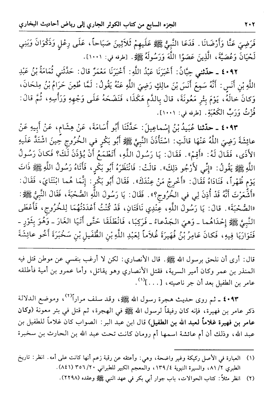 4093 - ثم روى حديث هجرة رسول الله - صلى الله عليه وسلم -، وقد سلف مرارًا، وموضع الدلالة ذكر عامر بن فهيرة، فإنه كان رفيقًا لرسول الله - صلى الله عليه وسلم - في الهجرة، ثم قتل في بئر معونة (وكان عامر بن فهيرة كلامًا لعبد الله بن الطفيل) قال ابن عبد البر: الصواب كان غلامًا للطفيل بن عبد الله، وذلك أن أم عائشة اسمها أم رومان كانت تحت عبد الله بن الحارث بن سخبرة