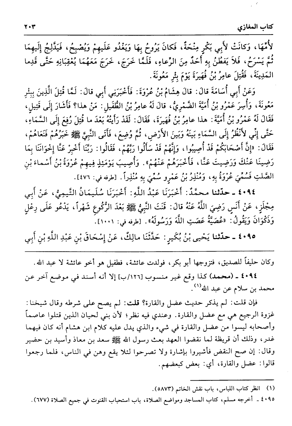 فإن قلت: لم يذكر حديث عضل والقارة؟ قلت: لم يصح على شرطه وقال شيخنا: غزوة الرجيع هي مع عضل والقارة. وعندي فيه نظر؛ لأن بني لحيان الذين قتلوا عاصمًا وأصحابه ليسوا من عضل والقارة في شيء والذي يدل عليه كلام ابن هشام أنه كان فيهما غدر، وذلك أن قريظة لما نقضوا العهد بعث رسول الله - صلى الله عليه وسلم - سعد بن معاذ وأسيد بن حضير وقال: إن صح النقض فأشيروا بإشارة ولا تصرحوا لئلا يقع وهن في الناس، فلما رجعوا قالوا: عضل والقارة، أي: بعض كبعضهم.
