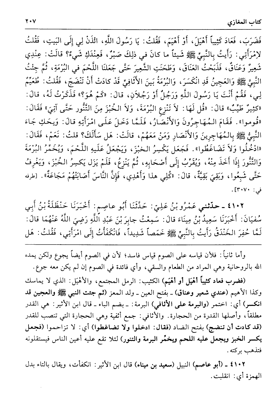 (فضرب فعاد كثيبًا أهْيَل أو أهْيَم) الكثيب: الرمل المجتمع، والأهْيَل: الذي لا يماسك وكذا الأهيم (عندي شعير وعناق) -بفتح العين- ولد المعز (ثم جئت النبي - صلى الله عليه وسلم - والعجين قد انكسر) أي: اختمر (والبرمة على الأثافي) البرمة: -بضم الباء- قال ابن الأثير: هي القدر مطلقًا، وأصلها القدرة من الحجارة. والأثافي: جمع أثفية وهي الحجارة التي تنصب للقدر (قد كادت أن تنضج) بفتح الضاد (فقال: ادخلوا ولا تضاغطوا) أي: لا تزاحموا (فجعل يكسر الخبز ويجعل عليه اللحم ويخمِّر البرمة والتنور) لئلا تقع عليه أعين الناس فيستقلونه فتذهب بركته.