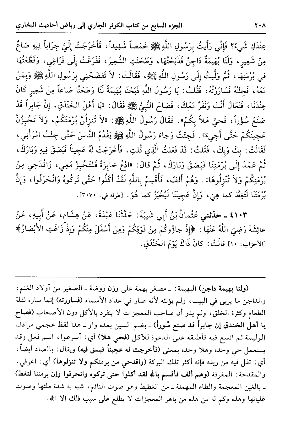(ولنا بهيمة داجن) البهيمة: -مصغر بهمة على وزن روضة- الصغير من أولاد الغنم، والداجن ما يربى في البيت، ولم يؤنثه لأنه صار في عداد الأسماء (فساررته) إنما ساره لقلة الطعام وكثرة الخلق، ولم يدر أن صاحب المعجزات لا ينفرد بالأكل دون الأصحاب (فصاح يا أهل الخندق إن جابرًا قد صنع سُورًا) -بضم السين بعده واو- هذا لفظ عجمي مرادف الوليمة ثم اتسع فيه فأطلقه على الدعوة للأكل (فحي هلا) أي: أسرعوا، اسم فعل وقد يستعمل حي وحده وهلا وحده بمعنى (فأخرجت له عجينًا فبسق فيه) ويقال: بالصاد أيضًا، أي: تفل فيه من ريقه فإنه أكثر تلك البركة (واقدحي من برمتكم ولا تنزلوها) أي: اغرفي، والمقدحة: المغرفة (وهم ألف فأقسم بالله لقد أكلوا حتى تركوه وانحرفوا وإن برمتنا لتغط) -بالغين المعجمة والطاء المهملة- من الغطيط وهو صوت النائم، شبه به شدة ملئها وصوت غليانها وهذه وكم له من هذه من باهر المعجزات لا يطلع على سبب ذلك إلا الله.