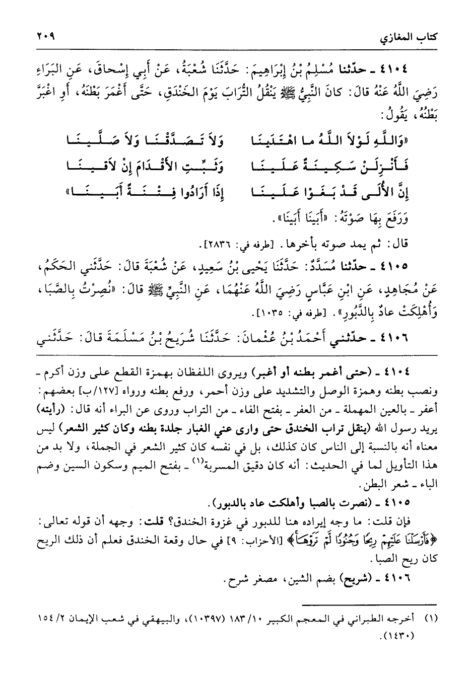 4104 - (حتى أغمر بطنه أو أغبر) ويروى اللفظان بهمزة القطع على وزن أكرم- ونصب بطنه وهمزة الوصل والتشديد على وزن أحمر، ورفع بطنه ورواه بعضهم: أعفر -بالعين المهملة- من العفر -بفتح الفاء- من التراب وروى عن البراء أنه قال: (رأيته) يريد رسول الله (ينقل تراب الخندق حتى وارى عني الغبار جلدة بطنه وكان كثير الشعر) ليس معناه أنه بالنسبة إلى الناس كان كذلك، بل في نفسه كان كثير الشعر في الجملة، ولا بد من هذا التأويل لما في الحديث: أنه كان دقيق المسربة -بفتح الميم وسكون السين وضم الباء- شعر البطن.