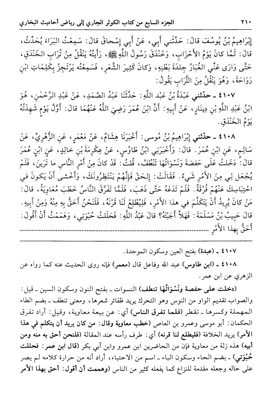 (دخلت على حفصة ونسْوَاتُهَا تنطف) النسوات -بفتح النون وسكون السين- قيل: والصواب نقديم الواو من النوس وهو التحرك يريد ظفائر شعرها، ومعنى تنطف -بضم الطاء المهملة وكسرها- تقطر (فلما تفرق الناس) أي: عن بيعة معاوية، وقيل: أراد تفرق الحكمان: أبو موسى وعمرو بن العاص (خطب معاوية وقال: من كان يريد أن يتكلم في هذا الأمر) يريد الخلافة (فليطلع لنا قرنه) أي: طرف رأسه عند المقالة (فلنحن أحق به منه ومن أبيه) هذه زلة من معاوية فإن من الحاضرين ابن عمرو وابن أبي بكر (قال ابن عمر: فحللت حُبْوَتي) -بضم الحاء وسكون الباء- اسم من الاحتباء، أراد أنه من حرارة كلامه لم يصر على حاله وجعله مقدمة للنزاع كما يفعله كثير من الناس (وهممت أن أقول: أحق بهذا الأمر