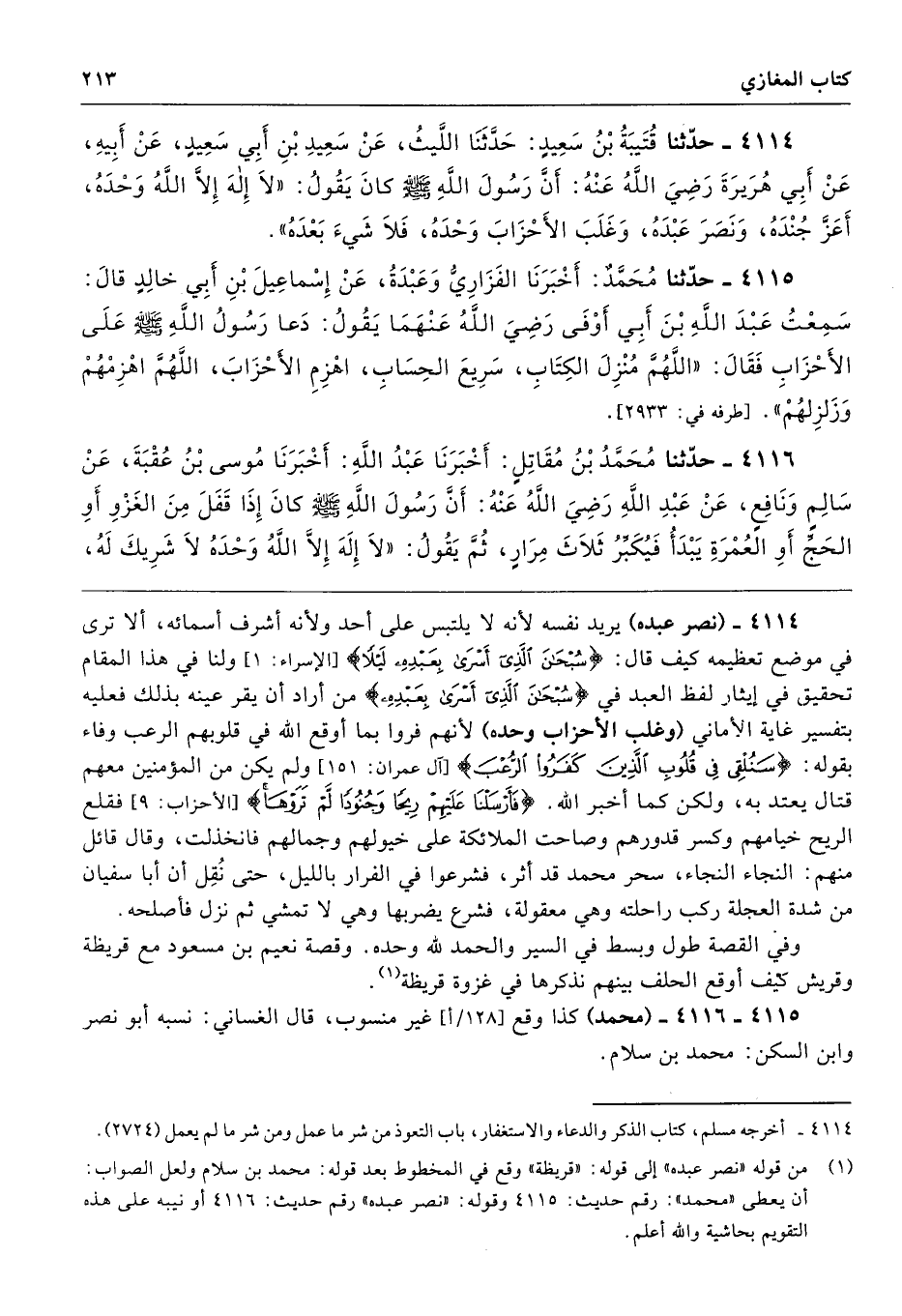 4114 - (نصر عبده) يريد نفسه لأنه لا يلتبس على أحد ولأنه أشرف أسمائه، ألا ترى في موضع تعظيمه كيف قال: {سُبْحَانَ الَّذِي أَسْرَى بِعَبْدِهِ لَيْلًا} [الإسراء: 1] ولنا في هذا المقام تحقيق في إيثار لفظ العبد في {سُبْحَانَ الَّذِي أَسْرَى بِعَبْدِهِ} من أراد أن يقر عينه بذلك فعليه بتفسير غاية الأماني (وغلب الأحزاب وحده) لأنهم فروا بما أوقع الله في قلوبهم الرعب وفاء بقوله: {سَنُلْقِي فِي قُلُوبِ الَّذِينَ كَفَرُوا الرُّعْبَ)} [آل عمران: 151] ولم يكن من المؤمنين معهم قتال يعتد به، ولكن كما أخبر الله. {فَأَرْسَلْنَا عَلَيْهِمْ رِيحًا وَجُنُودًا لَمْ تَرَوْهَا} [الأحزاب: 9] فقلع الريح خيامهم وكسر قدورهم وصاحت الملائكة على خيولهم وجمالهم فانخذلت، وقال قائل منهم: النجاء النجاء، سحر محمد قد أثر، فشرعوا في الفرار بالليل، حتى نُقِل أن أبا سفيان من شدة العجلة ركب راحلته وهي معقولة، فشرع يضربها وهي لا تمشي ثم نزل فأصلحه.