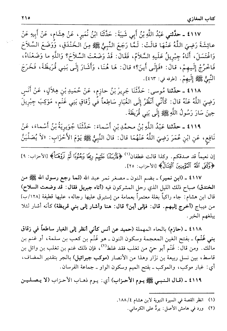 4118 - (حازم) بالحاء المهملة (حميد عن أنس كأني أنظر إلى الغبار ساطعًا في زقاق بني غَنْم) -بفتح الغين المعجمة وسكون النون- هو غَنْم بن كعب بن سلمة، أو غنم بن مالك. ومن قال: غَنْم أبو حيّ من تغلب فقد غلط، فإن ذلك غنم بن تغلب بن وائل بن قاسط، بين نسل ربيعة بن نزَار وهذا من الأنصار (موكب جبرائيل) بالجر بتقدير المضاف، أي: غبار موكب، والموكب -بفتح الميم وسكون الواو- جماعة الفرسان.