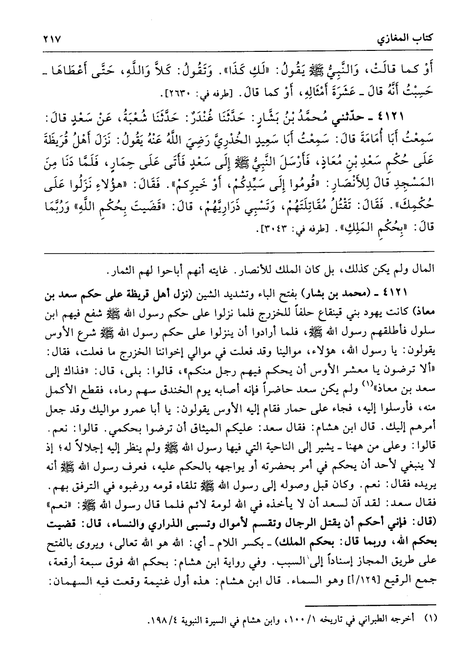 4121 - حَدَّثَنِى مُحَمَّدُ بْنُ بَشَّارٍ حَدَّثَنَا غُنْدَرٌ حَدَّثَنَا شُعْبَةُ عَنْ سَعْدٍ قَالَ سَمِعْتُ أَبَا أُمَامَةَ قَالَ سَمِعْتُ أَبَا سَعِيدٍ الْخُدْرِىَّ - رضى الله عنه - يَقُولُ نَزَلَ أَهْلُ قُرَيْظَةَ عَلَى حُكْمِ سَعْدِ بْنِ مُعَاذٍ، فَأَرْسَلَ النَّبِىُّ - صلى الله عليه وسلم - إِلَى سَعْدٍ، فَأَتَى عَلَى حِمَارٍ، فَلَمَّا دَنَا مِنَ الْمَسْجِدِ قَالَ لِلأَنْصَارِ «قُومُوا إِلَى سَيِّدِكُمْ - أَوْ - خَيْرِكُمْ». فَقَالَ «هَؤُلاَءِ نَزَلُوا عَلَى حُكْمِكَ». فَقَالَ تَقْتُلُ مُقَاتِلَتَهُمْ وَتَسْبِى ذَرَارِيَّهُمْ. قَالَ «قَضَيْتَ بِحُكْمِ اللَّهِ». وَرُبَّمَا قَالَ «بِحُكْمِ الْمَلِكِ». طرفه 3043