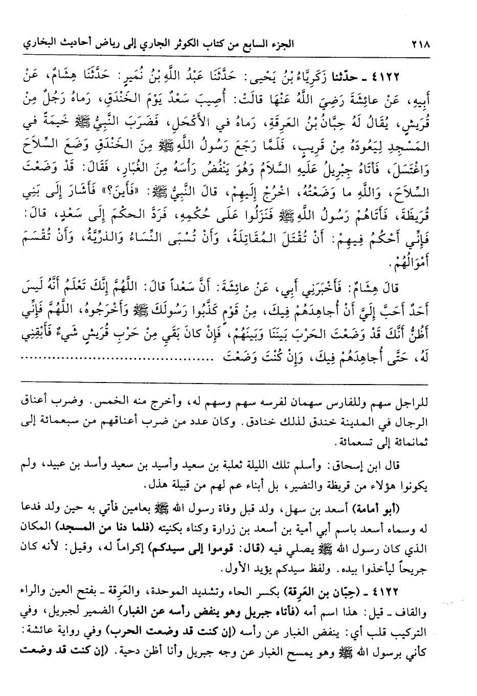 4122 - حَدَّثَنَا زَكَرِيَّاءُ بْنُ يَحْيَى حَدَّثَنَا عَبْدُ اللَّهِ بْنُ نُمَيْرٍ حَدَّثَنَا هِشَامٌ عَنْ أَبِيهِ عَنْ عَائِشَةَ - رضى الله عنها - قَالَتْ أُصِيبَ سَعْدٌ يَوْمَ الْخَنْدَقِ، رَمَاهُ رَجُلٌ مِنْ قُرَيْشٍ يُقَالُ لَهُ حِبَّانُ ابْنُ الْعَرِقَةِ، رَمَاهُ فِي الأَكْحَلِ، فَضَرَبَ النَّبِىُّ - صلى الله عليه وسلم - خَيْمَةً فِي الْمَسْجِدِ لِيَعُودَهُ مِنْ قَرِيبٍ، فَلَمَّا رَجَعَ رَسُولُ اللَّهِ - صلى الله عليه وسلم - مِنَ الْخَنْدَقِ وَضَعَ السِّلاَحَ وَاغْتَسَلَ، فَأَتَاهُ جِبْرِيلُ - عَلَيْهِ السَّلاَمُ - وَهْوَ يَنْفُضُ رَأْسَهُ مِنَ الْغُبَارِ فَقَالَ قَدْ وَضَعْتَ السِّلاَحَ وَاللَّهِ مَا وَضَعْتُهُ، اخْرُجْ إِلَيْهِمْ. قَالَ النَّبِىُّ - صلى الله عليه وسلم - «فَأَيْنَ». فَأَشَارَ إِلَى بَنِى قُرَيْظَةَ، فَأَتَاهُمْ رَسُولُ اللَّهِ - صلى الله عليه وسلم - فَنَزَلُوا عَلَى حُكْمِهِ، فَرَدَّ الْحُكْمَ إِلَى سَعْدٍ، قَالَ فَإِنِّى أَحْكُمُ فِيهِمْ أَنْ تُقْتَلَ الْمُقَاتِلَةُ، وَأَنْ تُسْبَى النِّسَاءُ وَالذُّرِّيَّةُ، وَأَنْ تُقْسَمَ أَمْوَالُهُمْ. قَالَ هِشَامٌ فَأَخْبَرَنِى أَبِى عَنْ عَائِشَةَ أَنَّ سَعْدًا قَالَ اللَّهُمَّ إِنَّكَ تَعْلَمُ أَنَّهُ لَيْسَ أَحَدٌ أَحَبَّ إِلَىَّ أَنْ أُجَاهِدَهُمْ فِيكَ مِنْ قَوْمٍ كَذَّبُوا رَسُولَكَ - صلى الله عليه وسلم - وَأَخْرَجُوهُ، اللَّهُمَّ فَإِنِّى أَظُنُّ أَنَّكَ قَدْ وَضَعْتَ الْحَرْبَ بَيْنَنَا وَبَيْنَهُمْ، فَإِنْ كَانَ بَقِىَ مِنْ حَرْبِ قُرَيْشٍ شَىْءٌ، فَأَبْقِنِى لَهُ حَتَّى أُجَاهِدَهُمْ فِيكَ، وَإِنْ كُنْتَ وَضَعْتَ