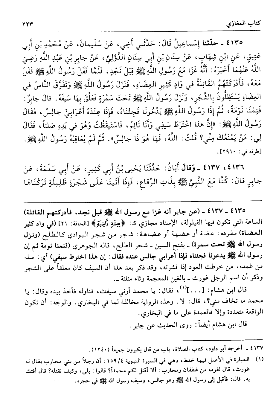 4135 - حَدَّثَنَا إِسْمَاعِيلُ قَالَ حَدَّثَنِى أَخِى عَنْ سُلَيْمَانَ عَنْ مُحَمَّدِ بْنِ أَبِى عَتِيقٍ عَنِ ابْنِ شِهَابٍ عَنْ سِنَانِ بْنِ أَبِى سِنَانٍ الدُّؤَلِىِّ عَنْ جَابِرِ بْنِ عَبْدِ اللَّهِ - رضى الله عنهما - أَخْبَرَهُ أَنَّهُ غَزَا مَعَ رَسُولِ اللَّهِ - صلى الله عليه وسلم - قِبَلَ نَجْدٍ، فَلَمَّا قَفَلَ رَسُولُ اللَّهِ - صلى الله عليه وسلم - قَفَلَ مَعَهُ، فَأَدْرَكَتْهُمُ الْقَائِلَةُ فِي وَادٍ كَثِيرِ الْعِضَاهِ، فَنَزَلَ رَسُولُ اللَّهِ - صلى الله عليه وسلم -، وَتَفَرَّقَ النَّاسُ فِي الْعِضَاهِ يَسْتَظِلُّونَ بِالشَّجَرِ، وَنَزَلَ رَسُولُ اللَّهِ - صلى الله عليه وسلم - تَحْتَ سَمُرَةٍ، فَعَلَّقَ بِهَا سَيْفَهُ، قَالَ جَابِرٌ فَنِمْنَا نَوْمَةً، ثُمَّ إِذَا رَسُولُ اللَّهِ - صلى الله عليه وسلم - يَدْعُونَا، فَجِئْنَاهُ فَإِذَا عِنْدَهُ أَعْرَابِىٌّ جَالِسٌ فَقَالَ رَسُولُ اللَّهِ - صلى الله عليه وسلم - «إِنَّ هَذَا اخْتَرَطَ سَيْفِى، وَأَنَا نَائِمٌ فَاسْتَيْقَظْتُ، وَهْوَ فِي يَدِهِ صَلْتًا، فَقَالَ لِى مَنْ يَمْنَعُكَ مِنِّى قُلْتُ اللَّهُ. فَهَا هُوَ ذَا جَالِسٌ». ثُمَّ لَمْ يُعَاقِبْهُ رَسُولُ اللَّهِ - صلى الله عليه وسلم -. طرفه 2910