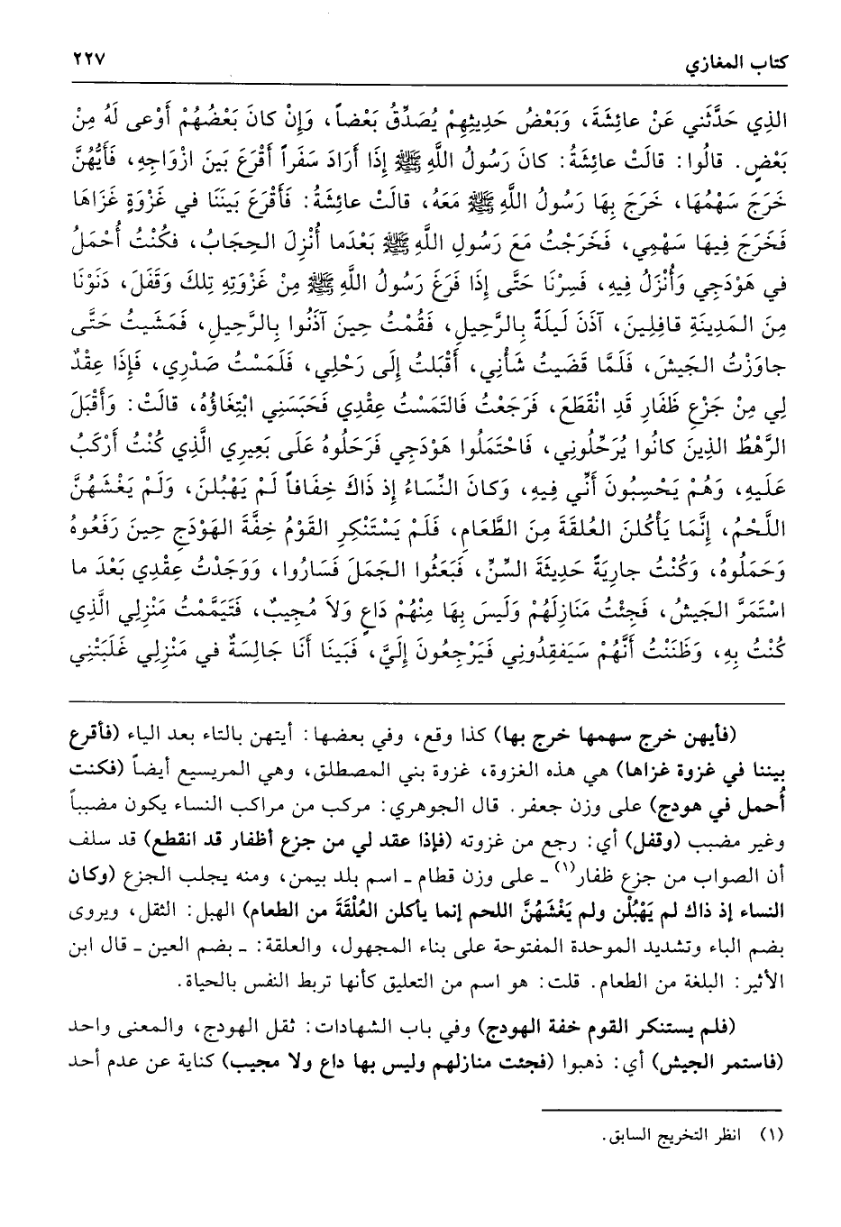 (فأيهن خرج سهمها خرج بها) كذا وقع، وفي بعضها: أيتهن بالتاء بعد الياء (فأقرع بيننا في غزوة غزاها) هي هذه الغزوة، غزوة بني المصطلق، وهي المريسيع أيضًا (فكنت أُحمل في هودج) على وزن جعفر. قال الجوهري: مركب من مراكب النساء يكون مضببًا وغير مضبب (وقفل) أي: رجع من غزوته (فإذا عقد لي من جزع أظفار قد انقطع) قد سلف أن الصواب من جزع ظفار -على وزن قطام- اسم بلد بيمن، ومنه يجلب الجزع (وكان النساء إذ ذاك لم يَهْبُلْن ولم يَغْشَهُنَّ اللحم إنما يأكلن العُلْقَةَ من الطعام) الهبل: الثقل، ويروى بضم الباء وتشديد الموحدة المفتوحة على بناء المجهول، والعلقة: -بضم العين- قال ابن الأثير: البلغة من الطعام. قلت: هو اسم من التعليق كأنها تربط النفس بالحياة.
