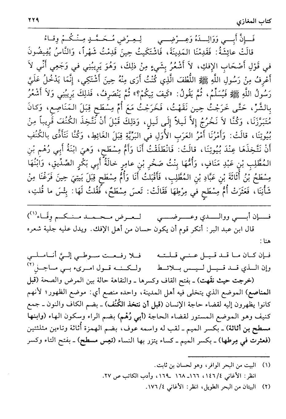 قَالَتْ عَائِشَةُ فَقَدِمْنَا الْمَدِينَةَ فَاشْتَكَيْتُ حِينَ قَدِمْتُ شَهْرًا، وَالنَّاسُ يُفِيضُونَ فِي قَوْلِ أَصْحَابِ الإِفْكِ، لاَ أَشْعُرُ بِشَىْءٍ مِنْ ذَلِكَ، وَهْوَ يَرِيبُنِى فِي وَجَعِى أَنِّى لاَ أَعْرِفُ مِنْ رَسُولِ اللَّهِ - صلى الله عليه وسلم - اللُّطْفَ الَّذِى كُنْتُ أَرَى مِنْهُ حِينَ أَشْتَكِى، إِنَّمَا يَدْخُلُ عَلَىَّ رَسُولُ اللَّهِ - صلى الله عليه وسلم - فَيُسَلِّمُ ثُمَّ يَقُولُ «كَيْفَ تِيكُمْ» ثُمَّ يَنْصَرِفُ، فَذَلِكَ يَرِيبُنِى وَلاَ أَشْعُرُ بِالشَّرِّ، حَتَّى خَرَجْتُ حِينَ نَقَهْتُ، فَخَرَجْتُ مَعَ أُمِّ مِسْطَحٍ قِبَلَ الْمَنَاصِعِ، وَكَانَ مُتَبَرَّزَنَا، وَكُنَّا لاَ نَخْرُجُ إِلاَّ لَيْلاً إِلَى لَيْلٍ، وَذَلِكَ قَبْلَ أَنْ نَتَّخِذَ الْكُنُفَ قَرِيبًا مِنْ بُيُوتِنَا. قَالَتْ وَأَمْرُنَا أَمْرُ الْعَرَبِ الأُوَلِ فِي الْبَرِّيَّةِ قِبَلَ الْغَائِطِ، وَكُنَّا نَتَأَذَّى بِالْكُنُفِ أَنْ نَتَّخِذَهَا عِنْدَ بُيُوتِنَا، قَالَتْ فَانْطَلَقْتُ أَنَا وَأُمُّ مِسْطَحٍ وَهْىَ ابْنَةُ أَبِى رُهْمِ بْنِ الْمُطَّلِبِ بْنِ عَبْدِ مَنَافٍ، وَأُمُّهَا بِنْتُ صَخْرِ بْنِ عَامِرٍ خَالَةُ أَبِى بَكْرٍ الصِّدِّيقِ، وَابْنُهَا مِسْطَحُ بْنُ أُثَاثَةَ بْنِ عَبَّادِ بْنِ الْمُطَّلِبِ، فَأَقْبَلْتُ أَنَا وَأُمُّ مِسْطَحٍ قِبَلَ بَيْتِى، حِينَ فَرَغْنَا مِنْ شَأْنِنَا، فَعَثَرَتْ أُمُّ مِسْطَحٍ فِي مِرْطِهَا فَقَالَتْ تَعِسَ مِسْطَحٌ. فَقُلْتُ لَهَا بِئْسَ مَا قُلْتِ،