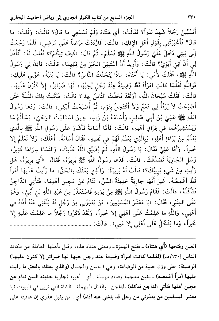 أَتَسُبِّينَ رَجُلاً شَهِدَ بَدْرًا فَقَالَتْ أَىْ هَنْتَاهْ وَلَمْ تَسْمَعِى مَا قَالَ قَالَتْ وَقُلْتُ مَا قَالَ فَأَخْبَرَتْنِى بِقَوْلِ أَهْلِ الإِفْكِ - قَالَتْ - فَازْدَدْتُ مَرَضًا عَلَى مَرَضِى، فَلَمَّا رَجَعْتُ إِلَى بَيْتِى دَخَلَ عَلَىَّ رَسُولُ اللَّهِ - صلى الله عليه وسلم - فَسَلَّمَ ثُمَّ قَالَ «كَيْفَ تِيكُمْ». فَقُلْتُ لَهُ أَتَأْذَنُ لِى أَنْ آتِىَ أَبَوَىَّ قَالَتْ وَأُرِيدُ أَنْ أَسْتَيْقِنَ الْخَبَرَ مِنْ قِبَلِهِمَا، قَالَتْ فَأَذِنَ لِى رَسُولُ اللَّهِ - صلى الله عليه وسلم -، فَقُلْتُ لأُمِّى يَا أُمَّتَاهُ مَاذَا يَتَحَدَّثُ النَّاسُ قَالَتْ يَا بُنَيَّةُ هَوِّنِى عَلَيْكِ، فَوَاللَّهِ لَقَلَّمَا كَانَتِ امْرَأَةٌ قَطُّ وَضِيئَةً عِنْدَ رَجُلٍ يُحِبُّهَا لَهَا ضَرَائِرُ إِلاَّ كَثَّرْنَ عَلَيْهَا. قَالَتْ فَقُلْتُ سُبْحَانَ اللَّهِ أَوَلَقَدْ تَحَدَّثَ النَّاسُ بِهَذَا قَالَتْ فَبَكَيْتُ تِلْكَ اللَّيْلَةَ، حَتَّى أَصْبَحْتُ لاَ يَرْقَأُ لِى دَمْعٌ، وَلاَ أَكْتَحِلُ بِنَوْمٍ، ثُمَّ أَصْبَحْتُ أَبْكِى - قَالَتْ - وَدَعَا رَسُولُ اللَّهِ - صلى الله عليه وسلم - عَلِىَّ بْنَ أَبِى طَالِبٍ وَأُسَامَةَ بْنَ زَيْدٍ حِينَ اسْتَلْبَثَ الْوَحْىُ يَسْأَلُهُمَا وَيَسْتَشِيرُهُمَا فِي فِرَاقِ أَهْلِهِ - قَالَتْ - فَأَمَّا أُسَامَةُ فَأَشَارَ عَلَى رَسُولِ اللَّهِ - صلى الله عليه وسلم - بِالَّذِى يَعْلَمُ مِنْ بَرَاءَةِ أَهْلِهِ، وَبِالَّذِى يَعْلَمُ لَهُمْ فِي نَفْسِهِ، فَقَالَ أُسَامَةُ أَهْلَكَ وَلاَ نَعْلَمُ إِلاَّ خَيْرًا. وَأَمَّا عَلِىٌّ فَقَالَ يَا رَسُولَ اللَّهِ لَمْ يُضَيِّقِ اللَّهُ عَلَيْكَ، وَالنِّسَاءُ سِوَاهَا كَثِيرٌ، وَسَلِ الْجَارِيَةَ تَصْدُقْكَ. قَالَتْ فَدَعَا رَسُولُ اللَّهِ - صلى الله عليه وسلم - بَرِيرَةَ فَقَالَ «أَىْ بَرِيرَةُ هَلْ رَأَيْتِ مِنْ شَىْءٍ يَرِيبُكِ». قَالَتْ لَهُ بَرِيرَةُ وَالَّذِى بَعَثَكَ بِالْحَقِّ مَا رَأَيْتُ عَلَيْهَا أَمْرًا قَطُّ أَغْمِصُهُ، غَيْرَ أَنَّهَا جَارِيَةٌ حَدِيثَةُ السِّنِّ تَنَامُ عَنْ عَجِينِ أَهْلِهَا، فَتَأْتِى الدَّاجِنُ فَتَأْكُلُهُ - قَالَتْ - فَقَامَ رَسُولُ اللَّهِ - صلى الله عليه وسلم - مِنْ يَوْمِهِ، فَاسْتَعْذَرَ مِنْ عَبْدِ اللَّهِ بْنِ أُبَىٍّ وَهْوَ عَلَى الْمِنْبَرِ فَقَالَ «يَا مَعْشَرَ الْمُسْلِمِينَ مَنْ يَعْذِرُنِى مِنْ رَجُلٍ قَدْ بَلَغَنِى عَنْهُ أَذَاهُ فِي أَهْلِى، وَاللَّهِ مَا عَلِمْتُ عَلَى أَهْلِى إِلاَّ خَيْرًا، وَلَقَدْ ذَكَرُوا رَجُلاً مَا عَلِمْتُ عَلَيْهِ إِلاَّ خَيْرًا، وَمَا يَدْخُلُ عَلَى أَهْلِى إِلاَّ مَعِى». قَالَتْ