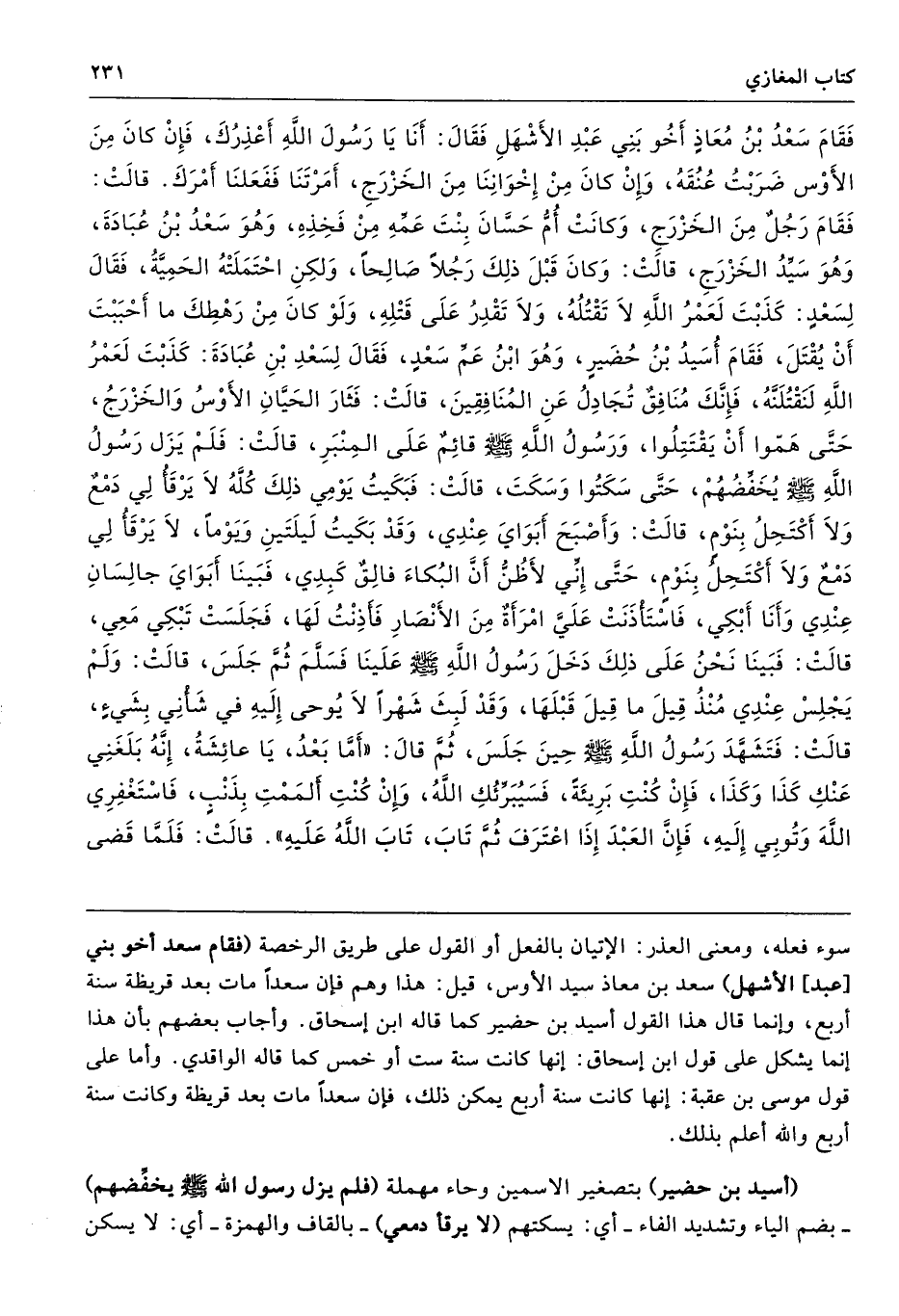 فَقَامَ سَعْدُ بْنُ مُعَاذٍ أَخُو بَنِى عَبْدِ الأَشْهَلِ فَقَالَ أَنَا يَا رَسُولَ اللَّهِ أَعْذِرُكَ، فَإِنْ كَانَ مِنَ الأَوْسِ ضَرَبْتُ عُنُقَهُ، وَإِنْ كَانَ مِنْ إِخْوَانِنَا مِنَ الْخَزْرَجِ أَمَرْتَنَا فَفَعَلْنَا أَمْرَكَ. قَالَتْ فَقَامَ رَجُلٌ مِنَ الْخَزْرَجِ، وَكَانَتْ أُمُّ حَسَّانَ بِنْتَ عَمِّهِ مِنْ فَخِذِهِ، وَهْوَ سَعْدُ بْنُ عُبَادَةَ، وَهْوَ سَيِّدُ الْخَزْرَجِ - قَالَتْ - وَكَانَ قَبْلَ ذَلِكَ رَجُلاً صَالِحًا، وَلَكِنِ احْتَمَلَتْهُ الْحَمِيَّةُ فَقَالَ لِسَعْدٍ كَذَبْتَ لَعَمْرُ اللَّهِ لاَ تَقْتُلُهُ، وَلاَ تَقْدِرُ عَلَى قَتْلِهِ، وَلَوْ كَانَ مِنْ رَهْطِكَ مَا أَحْبَبْتَ أَنْ يُقْتَلَ. فَقَامَ أُسَيْدُ بْنُ حُضَيْرٍ - وَهْوَ ابْنُ عَمِّ سَعْدٍ - فَقَالَ لِسَعْدِ بْنِ عُبَادَةَ كَذَبْتَ لَعَمْرُ اللَّهِ لَنَقْتُلَنَّهُ، فَإِنَّكَ مُنَافِقٌ تُجَادِلُ عَنِ الْمُنَافِقِينَ. قَالَتْ فَثَارَ الْحَيَّانِ الأَوْسُ وَالْخَزْرَجُ حَتَّى هَمُّوا أَنْ يَقْتَتِلُوا، وَرَسُولُ اللَّهِ - صلى الله عليه وسلم - قَائِمٌ عَلَى الْمِنْبَرِ - قَالَتْ - فَلَمْ يَزَلْ رَسُولُ اللَّهِ - صلى الله عليه وسلم - يُخَفِّضُهُمْ حَتَّى سَكَتُوا وَسَكَتَ - قَالَتْ - فَبَكَيْتُ يَوْمِى ذَلِكَ كُلَّهُ، لاَ يَرْقَأُ لِى دَمْعٌ، وَلاَ أَكْتَحِلُ بِنَوْمٍ - قَالَتْ - وَأَصْبَحَ أَبَوَاىَ عِنْدِى، وَقَدْ بَكَيْتُ لَيْلَتَيْنِ وَيَوْمًا، لاَ يَرْقَأُ لِى دَمْعٌ، وَلاَ أَكْتَحِلُ بِنَوْمٍ، حَتَّى إِنِّى لأَظُنُّ أَنَّ الْبُكَاءَ فَالِقٌ كَبِدِى، فَبَيْنَا أَبَوَاىَ جَالِسَانِ عِنْدِى وَأَنَا أَبْكِى فَاسْتَأْذَنَتْ عَلَىَّ امْرَأَةٌ مِنَ الأَنْصَارِ، فَأَذِنْتُ لَهَا، فَجَلَسَتْ تَبْكِى مَعِى - قَالَتْ - فَبَيْنَا نَحْنُ عَلَى ذَلِكَ دَخَلَ رَسُولُ اللَّهِ - صلى الله عليه وسلم - عَلَيْنَا، فَسَلَّمَ ثُمَّ جَلَسَ - قَالَتْ - وَلَمْ يَجْلِسْ عِنْدِى مُنْذُ قِيلَ مَا قِيلَ قَبْلَهَا، وَقَدْ لَبِثَ شَهْرًا لاَ يُوحَى إِلَيْهِ فِي شَأْنِى بِشَىْءٍ - قَالَتْ - فَتَشَهَّدَ رَسُولُ اللَّهِ - صلى الله عليه وسلم - حِينَ جَلَسَ ثُمَّ قَالَ «أَمَّا بَعْدُ، يَا عَائِشَةُ إِنَّهُ بَلَغَنِى عَنْكِ كَذَا وَكَذَا، فَإِنْ كُنْتِ بَرِيئَةً، فَسَيُبَرِّئُكِ اللَّهُ، وَإِنْ كُنْتِ أَلْمَمْتِ بِذَنْبٍ، فَاسْتَغْفِرِى اللَّهَ وَتُوبِى إِلَيْهِ، فَإِنَّ الْعَبْدَ إِذَا اعْتَرَفَ ثُمَّ تَابَ تَابَ اللَّهُ عَلَيْهِ». قَالَتْ فَلَمَّا قَضَى