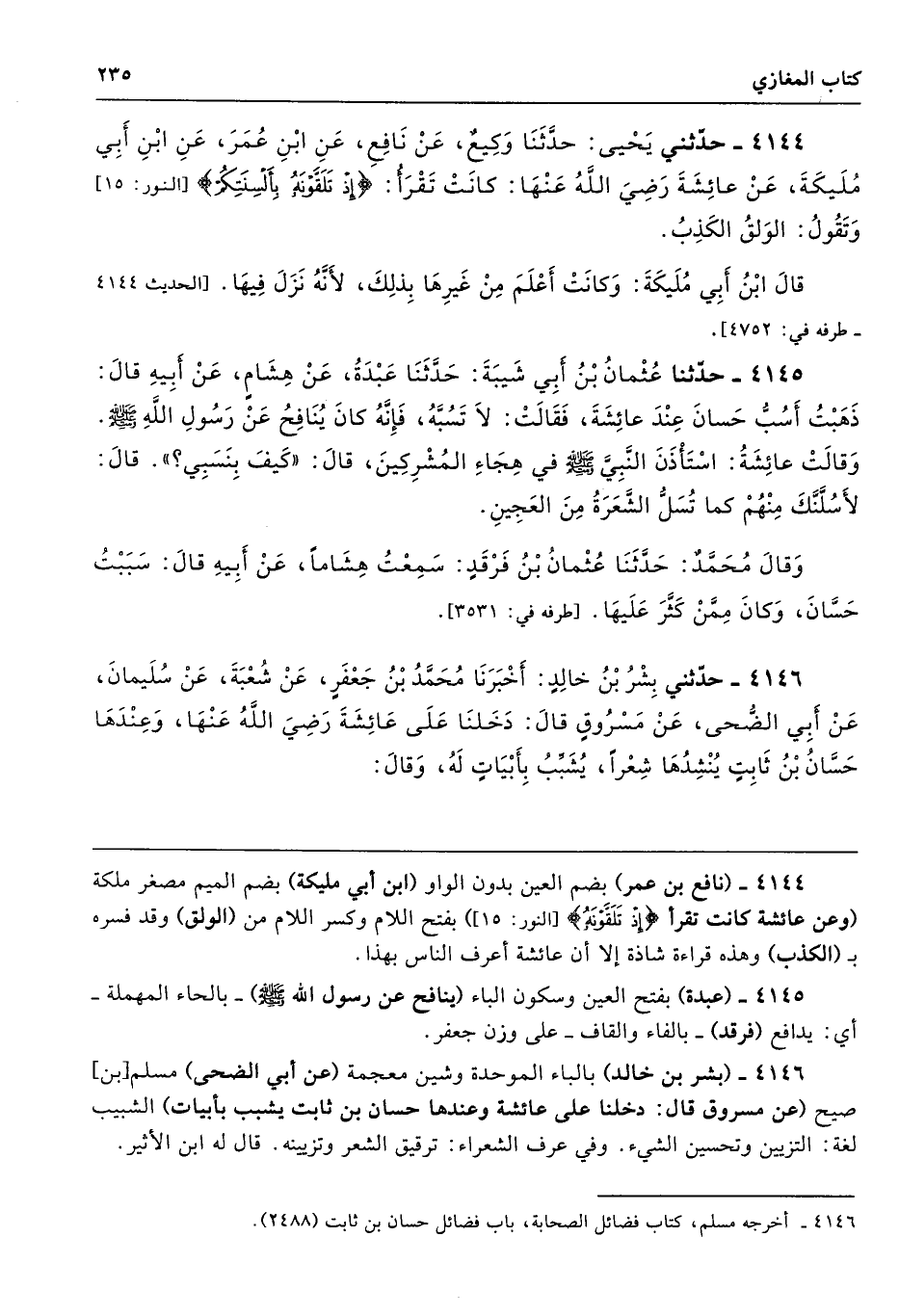 4144 - (نافع بن عمر) بضم العين بدون الواو (ابن أبي مليكة) بضم الميم مصغر ملكة (وعن عائشة كانت تقرأ {إِذْ تَلَقَّوْنَهُ} [النور: 15] بفتح اللام وكسر اللام من (الولق) وقد فسره بـ (الكذب) وهذه قراءة شاذة إلا أن عائشة أعرف الناس بهذا.
