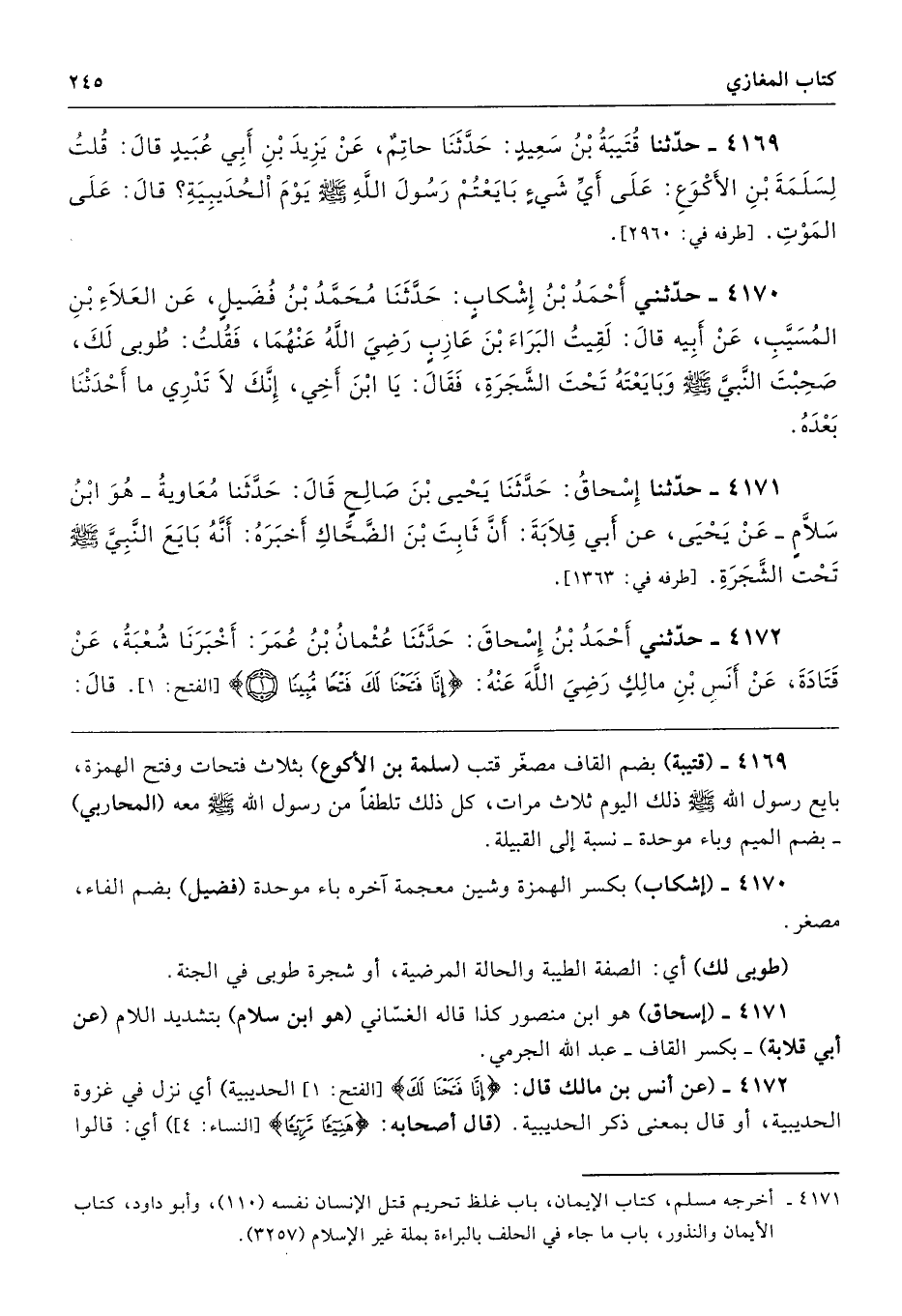 4169 - (قتيبة) بضم القاف مصغّر قتب (سلمة بن الأكوع) بثلاث فتحات وفتح الهمزة، بايع رسول الله - صلى الله عليه وسلم - ذلك اليوم ثلاث مرات، كل ذلك تلطفًا من رسول الله - صلى الله عليه وسلم - معه (المحاربي) -بضم الميم وباء موحدة- نسبة إلى القبيلة.