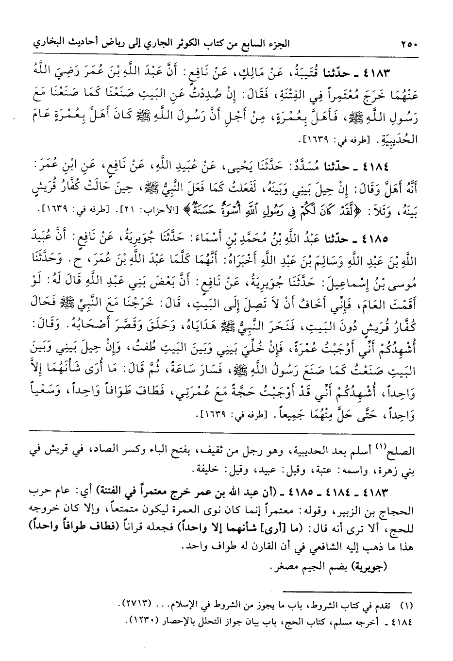 4183 - 4184 - 4185 - (أن عبد الله بن عمر خرج معتمرًا في الفتنة) أي: عام حرب الحجاج بن الزبير، وقوله: معتمرًا إنما كان نوى العمرة ليكون متمتعًا، وإلا كان خروجه للحج، ألا ترى أنه قال: (ما [أرى] شأنهما إلا واحدًا) فجعله قرانًا (فطاف طوافًا واحدًا) هذا ما ذهب إليه الشافعي في أن القارن له طواف واحد.