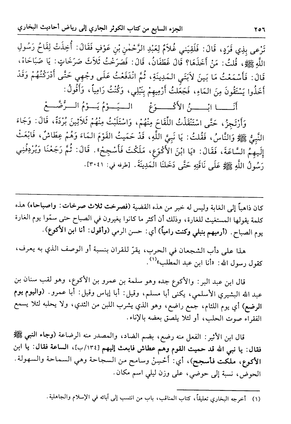 كان ذاهبًا إلى الغابة وليس له خبر من هذه القضية (فصرخت ثلاث صرخات: واصباحاه) هذه كلمة يقولها المستغيث للغارة، وذلك أن أكثر ما كانوا يغيرون في الصباح حتى سقوا يوم الغارة يوم الصباح. (أرميهم بنبلي وكنت راميًا) أي: حسن الرمي (وأقول: أنا ابن الأكوع).