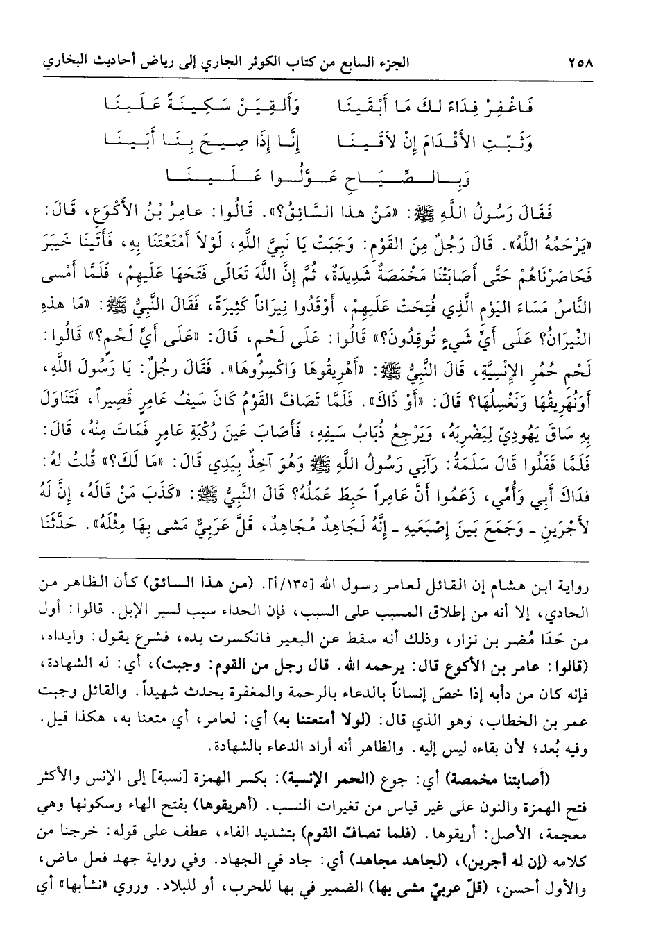 فَقَالَ رَسُولُ اللَّهِ - صلى الله عليه وسلم - «مَنْ هَذَا السَّائِقُ». قَالُوا عَامِرُ بْنُ الأَكْوَعِ. قَالَ «يَرْحَمُهُ اللَّهُ». قَالَ رَجُلٌ مِنَ الْقَوْمِ وَجَبَتْ يَا نَبِىَّ اللَّهِ، لَوْلاَ أَمْتَعْتَنَا بِهِ. فَأَتَيْنَا خَيْبَرَ، فَحَاصَرْنَاهُمْ حَتَّى أَصَابَتْنَا مَخْمَصَةٌ شَدِيدَةٌ، ثُمَّ إِنَّ اللَّهَ تَعَالَى فَتَحَهَا عَلَيْهِمْ، فَلَمَّا أَمْسَى النَّاسُ مَسَاءَ الْيَوْمِ الَّذِى فُتِحَتْ عَلَيْهِمْ أَوْقَدُوا نِيرَانًا كَثِيرَةً، فَقَالَ النَّبِىُّ - صلى الله عليه وسلم - «مَا هَذِهِ النِّيرَانُ عَلَى أَىِّ شَىْءٍ تُوقِدُونَ». قَالُوا عَلَى لَحْمٍ. قَالَ «عَلَى أَىِّ لَحْمٍ». قَالُوا لَحْمِ حُمُرِ الإِنْسِيَّةِ. قَالَ النَّبِىُّ - صلى الله عليه وسلم - «أَهْرِيقُوهَا وَاكْسِرُوهَا». فَقَالَ رَجُلٌ يَا رَسُولَ اللَّهِ، أَوْ نُهَرِيقُهَا وَنَغْسِلُهَا قَالَ «أَوْ ذَاكَ». فَلَمَّا تَصَافَّ الْقَوْمُ كَانَ سَيْفُ عَامِرٍ قَصِيرًا فَتَنَاوَلَ بِهِ سَاقَ يَهُودِىٍّ لِيَضْرِبَهُ، وَيَرْجِعُ ذُبَابُ سَيْفِهِ، فَأَصَابَ عَيْنَ رُكْبَةِ عَامِرٍ، فَمَاتَ مِنْهُ قَالَ فَلَمَّا قَفَلُوا، قَالَ سَلَمَةُ رَآنِى رَسُولُ اللَّهِ - صلى الله عليه وسلم - وَهْوَ آخِذٌ بِيَدِى، قَالَ «مَا لَكَ». قُلْتُ لَهُ فِدَاكَ أَبِى وَأُمِّى، زَعَمُوا أَنَّ عَامِرًا حَبِطَ عَمَلُهُ. قَالَ النَّبِىُّ - صلى الله عليه وسلم - «كَذَبَ مَنْ قَالَهُ، إِنَّ لَهُ لأَجْرَيْنِ - وَجَمَعَ بَيْنَ إِصْبَعَيْهِ - إِنَّهُ لَجَاهِدٌ مُجَاهِدٌ قَلَّ عَرَبِىٌّ مَشَى بِهَا مِثْلَهُ». حَدَّثَنَا