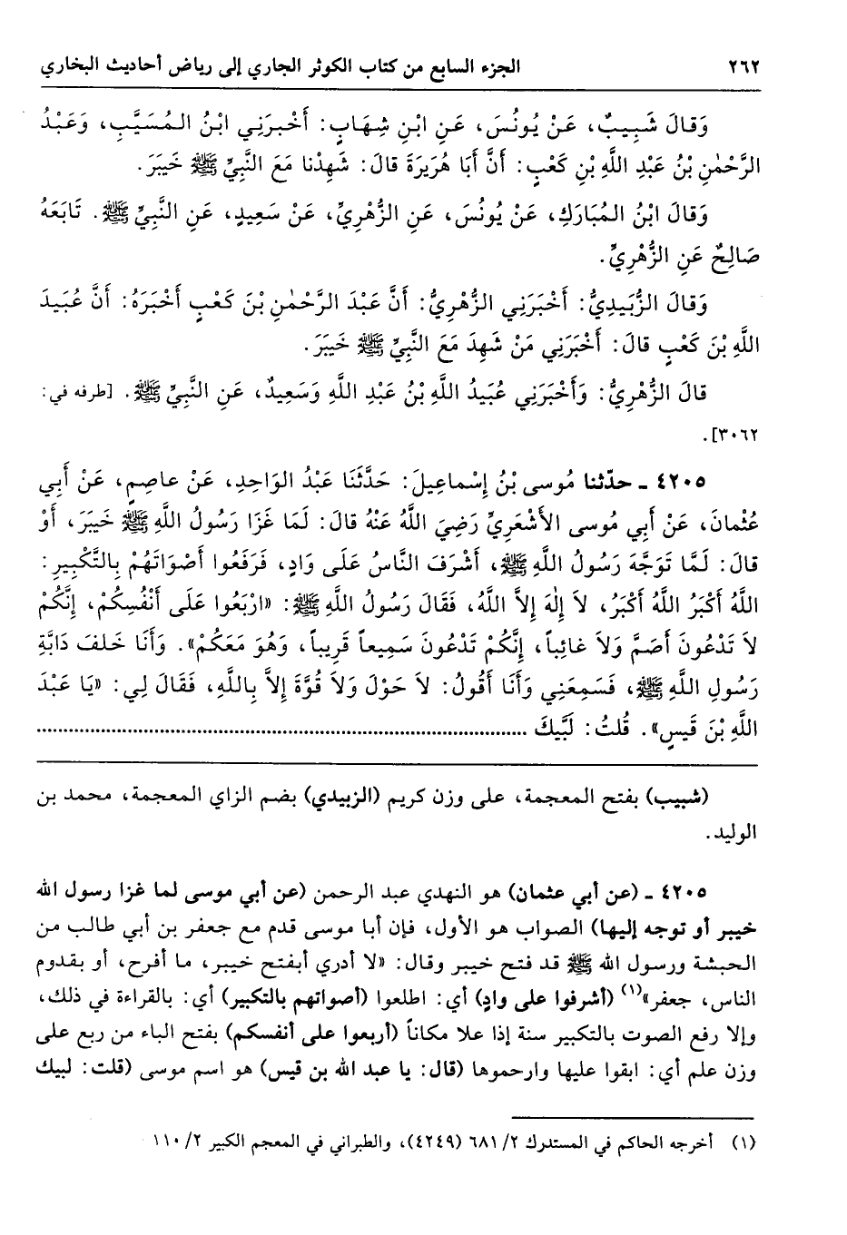 4205 - (عن أبي عثمان) هو النهدي عبد الرحمن (عن أبي موسى لما غزا رسول الله خيبر أو توجه إليها) الصواب هو الأول، فإن أبا موسى قدم مع جعفر بن أبي طالب من الحبشة ورسول الله - صلى الله عليه وسلم - قد فتح خيبر وقال: "لا أدري أبفتح خيبر، ما أفرح، أو بقدوم الناس، جعفر" (أشرفوا على وادٍ) أي: اطلعوا (أصواتهم بالتكبير) أي: بالقراءة في ذلك، وإلا رفع الصوت بالتكبير سنة إذا علا مكانًا (أربعوا على أنفسكم) بفتح الباء من ربع على وزن علم أي: ابقوا عليها وارحموها (قال: يا عبد الله بن قيس) هو اسم موسى (قلت: لبيك