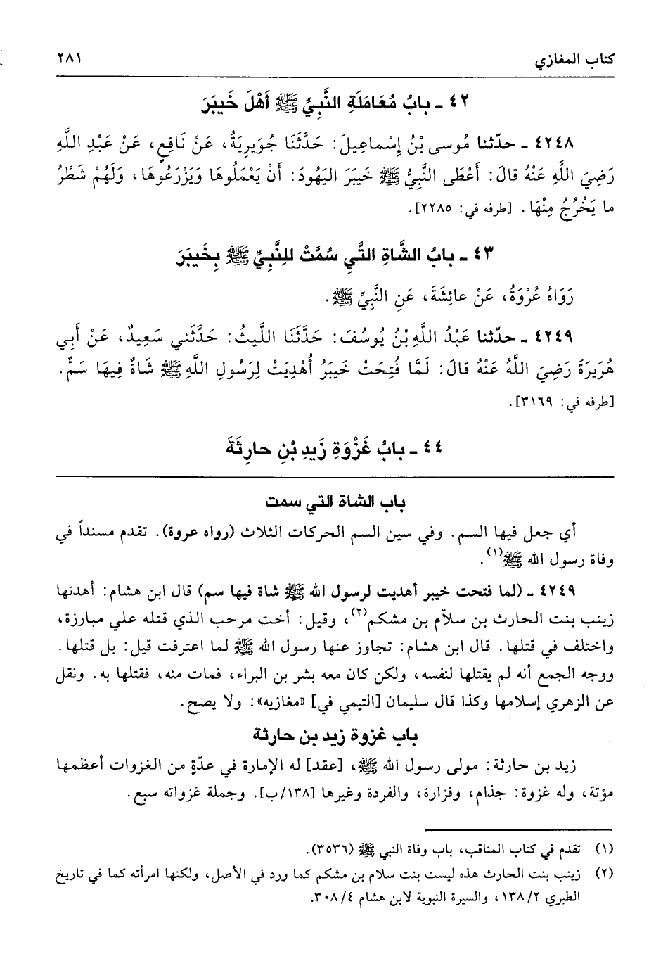 4249 - (لما فتحت خيبر أهديت لرسول الله - صلى الله عليه وسلم - شاة فيها سم) قال ابن هشام: أهدتها زينب بنت الحارث بن سلّام بن مشكم، وقيل: أخت مرحب الذي قتله علي مبارزة، واختلف في قتلها. قال ابن هشام: تجاوز عنها رسول الله - صلى الله عليه وسلم - لما اعترفت قيل: بل قتلها. ووجه الجمع أنه لم يقتلها لنفسه، ولكن كان معه بشر بن البراء، فمات منه، فقتلها به. ونقل عن الزهريّ إسلامها وكذا قال سليمان [التيمي في] "مغازيه": ولا يصح.
