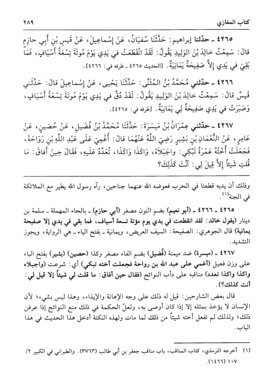 4265 - 4266 - (أبو نعيم) بضم النون مصغر (أبي حازم) -بالحاء المهملة- سلمة بن دينار (يقول خالد: لقد انقطعت في يدي يوم مؤتة تسعة أسياف، فما بقي في يدي إلا صفيحة يمانية) قال الجوهري: الصفيحة: السيف العريض، ويمانية -بفتح الياء- هي الرواية، ويجوز التشديد.