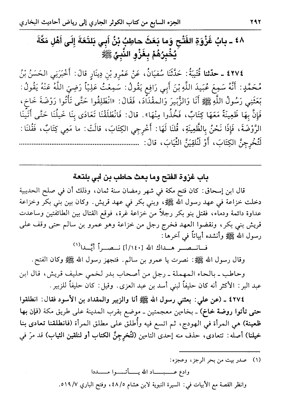 4274 - (عن علي: بعثني رسول الله - صلى الله عليه وسلم - أنا والزبير والمقداد بن الأسود فقال: انطلقوا حتى تأتوا روضة خاخ) -بخاءين معجمتين- موضع بقرب المدينة على طريق مكة (فإن بها ظعينة) هي المرأة في الهودج، ثم اتسع فيه وأُطلق على مطلق المرأة (فانطلقنا تعادى بنا خيلنا) أصله: تتعادى، حذف منه إحدى التاءين (لتُخرِجِنَّ الكتاب أو لنلقين الثياب) قد مرّ في