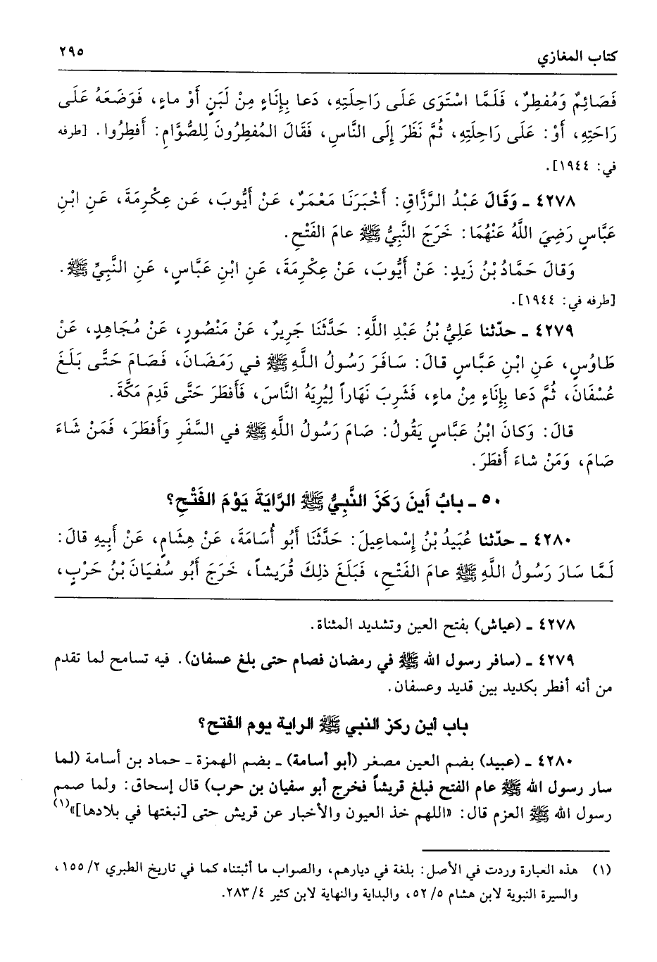 4279 - (سافر رسول الله - صلى الله عليه وسلم - في رمضان فصام حتى بلغ عسفان). فيه تسامح لما تقدم من أنه أفطر بكديد بين قديد وعسفان.