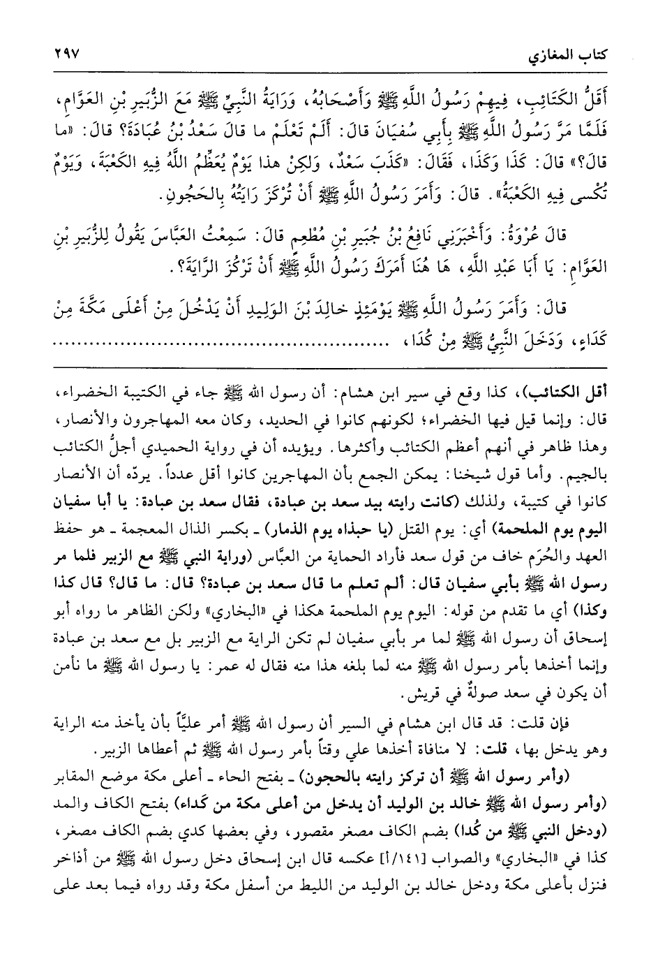 أَقَلُّ الْكَتَائِبِ، فِيهِمْ رَسُولُ اللَّهِ - صلى الله عليه وسلم - وَأَصْحَابُهُ، وَرَايَةُ النَّبِيِّ - صلى الله عليه وسلم - مَعَ الزُّبَيْرِ بْنِ الْعَوَّامِ، فَلَمَّا مَرَّ رَسُولُ اللَّهِ - صلى الله عليه وسلم - بِأَبِى سُفْيَانَ قَالَ أَلَمْ تَعْلَمْ مَا قَالَ سَعْدُ بْنُ عُبَادَةَ قَالَ «مَا قَالَ». قَالَ كَذَا وَكَذَا. فَقَالَ «كَذَبَ سَعْدٌ، وَلَكِنْ هَذَا يَوْمٌ يُعَظِّمُ اللَّهُ فِيهِ الْكَعْبَةَ، وَيَوْمٌ تُكْسَى فِيهِ الْكَعْبَةُ». قَالَ وَأَمَرَ رَسُولُ اللَّهِ - صلى الله عليه وسلم - أَنْ تُرْكَزَ رَايَتُهُ بِالْحَجُونِ. قَالَ عُرْوَةُ وَأَخْبَرَنِى نَافِعُ بْنُ جُبَيْرِ بْنِ مُطْعِمٍ قَالَ سَمِعْتُ الْعَبَّاسَ يَقُولُ لِلزُّبَيْرِ بْنِ الْعَوَّامِ يَا أَبَا عَبْدِ اللَّهِ، هَا هُنَا أَمَرَكَ رَسُولُ اللَّهِ - صلى الله عليه وسلم - أَنْ تَرْكُزَ الرَّايَةَ، قَالَ وَأَمَرَ رَسُولُ اللَّهِ - صلى الله عليه وسلم - يَوْمَئِذٍ خَالِدَ بْنَ الْوَلِيدِ أَنْ يَدْخُلَ مِنْ أَعْلَى مَكَّةَ مِنْ كَدَاءٍ، وَدَخَلَ النَّبِىُّ - صلى الله عليه وسلم - مِنْ كُدَا،