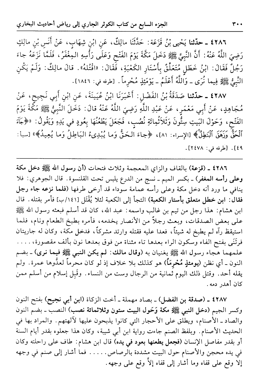 4287 - (صدقة بن الفضل) -بصاد مهملة- أخت الزكاة (ابن أبي نجيح) بفتح النون وكسر الجيم (دخل النبي - صلى الله عليه وسلم - مكة وَحَول البيت ستون وثلاثمائة نصب) النصب -بضم النون والصاد- الأصنام، ويطلق على الأحجار التي كانوا يذبحون عليها لآلهتهم. والمراد بها في الحديث الأصنام. وبلفظ الصنم جاءت رواية ابن أبي شيبة، وكان هذا جعلوه بقدر أيام السنة أو بقدر مفاصل الإنسان (فجعل يطعنها بعود في يده) قال ابن هشام: طاف على راحلته وكان في يده محجن والأصنام حول البيت مشددة بالرصاص. . . . . فما أشار إلى صنم في وجهه إلا وقع على قفاه وما أشار إلى قفاه إلَّا وقع على وجهه.