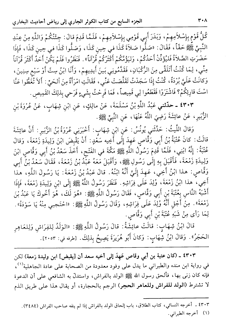 4303 - (كان عتبة بن أبي وقاص عَهِدَ إلى أخيه سعد أن [يقبض] ابن وليدة زمعة) لكن في رواية ابن منده والطبراني ما يدل على وفود معدودة من الصحابة على عادة الجاهلية، فإنَّه كان زنى بها، فألحق رسول الله - صلى الله عليه وسلم - الولد بالفراش، واستدلَّ به الشافعي على أن الدعوة لا تشترط (الولد للفراش وللعاهر الحجر) الرجم بالحجارة، أو يقال هذا على طريق الذم