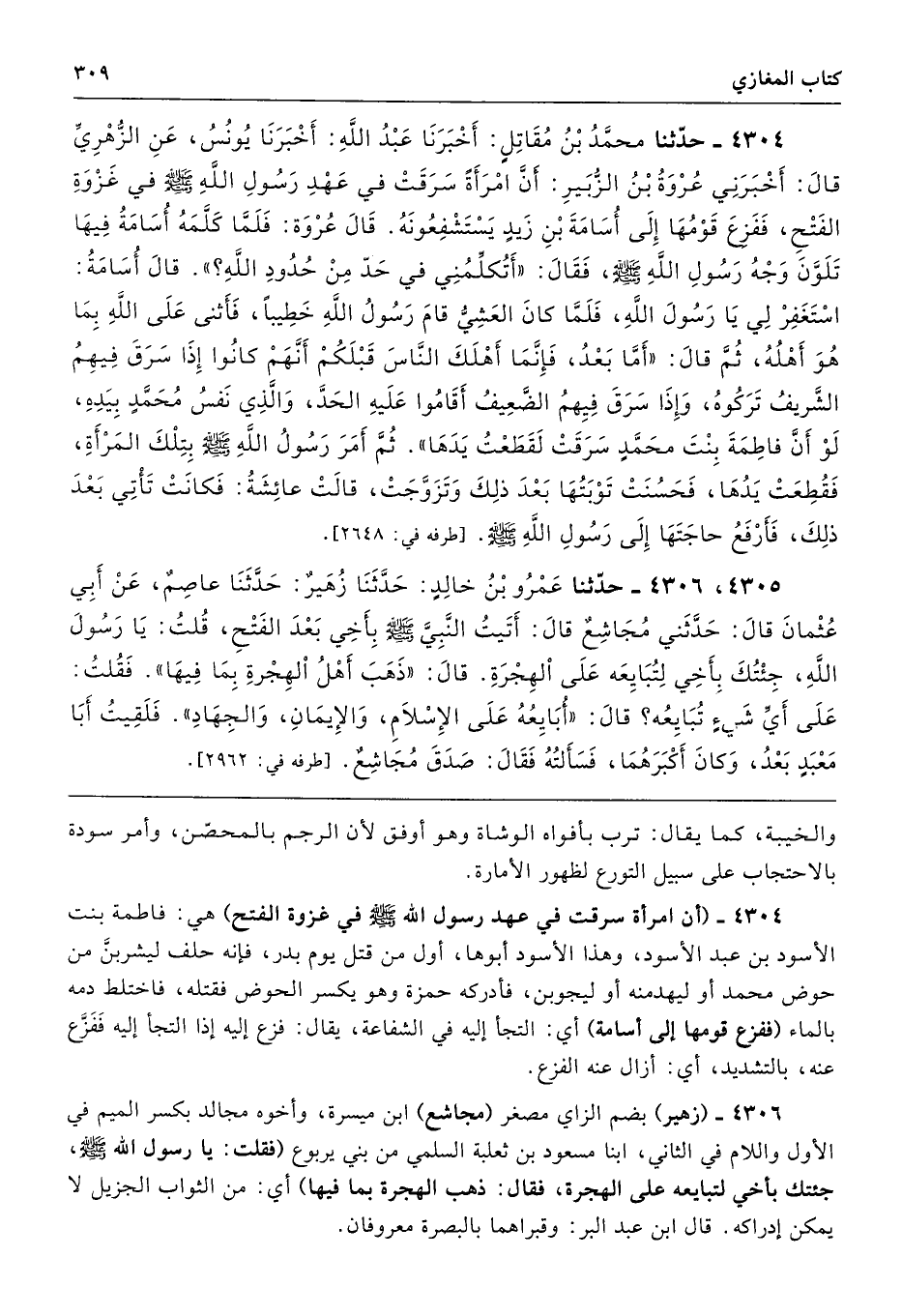 4304 - (أن امرأة سرقت في عهد رسول الله - صلى الله عليه وسلم - في غزوة الفتح) هي: فاطمة بنت الأسود بن عبد الأسود، وهذا الأسود أبوها، أول من قتل يوم بدر، فإنَّه حلف ليشربنَّ من حوض محمَّد أو ليهدمنه أو ليجوبن، فأدركه حمزة وهو يكسر الحوض فقتله، فاختلط دمه بالماء (ففزع قومها إلى أسامة) أي: التجأ إليه في الشفاعة، يقال: فزع إليه إذا التجأ إليه فَفَزَّع عنه، بالتشديد، أي: أزال عنه الفزع.