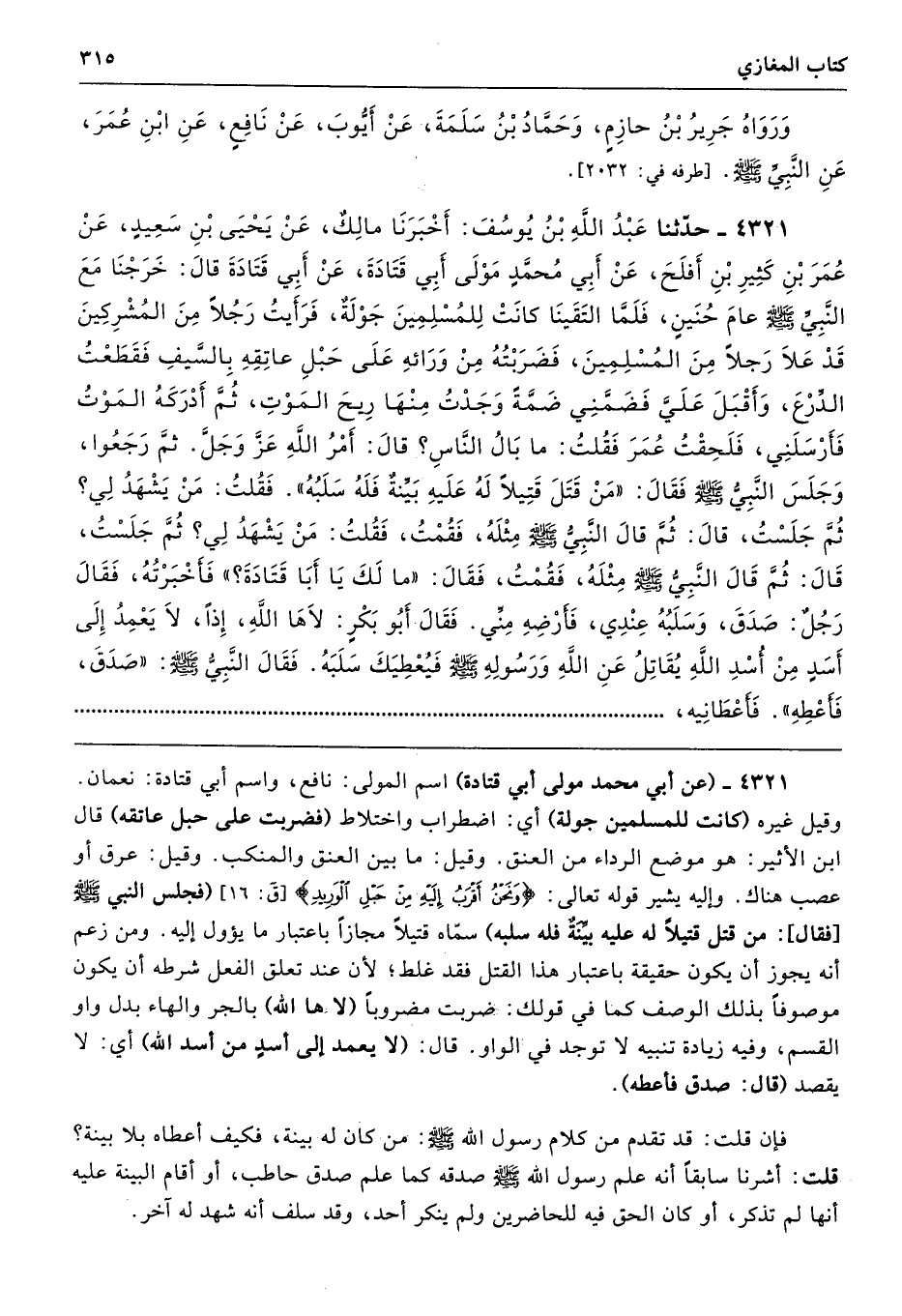 4321 - حَدَّثَنَا عَبْدُ اللَّهِ بْنُ يُوسُفَ أَخْبَرَنَا مَالِكٌ عَنْ يَحْيَى بْنِ سَعِيدٍ عَنْ عُمَرَ بْنِ كَثِيرِ بْنِ أَفْلَحَ عَنْ أَبِى مُحَمَّدٍ مَوْلَى أَبِى قَتَادَةَ عَنْ أَبِى قَتَادَةَ قَالَ خَرَجْنَا مَعَ النَّبِيِّ - صلى الله عليه وسلم - عَامَ حُنَيْنٍ، فَلَمَّا الْتَقَيْنَا كَانَتْ لِلْمُسْلِمِينَ جَوْلَةٌ، فَرَأَيْتُ رَجُلاً مِنَ الْمُشْرِكِينَ، قَدْ عَلاَ رَجُلاً مِنَ الْمُسْلِمِينَ، فَضَرَبْتُهُ مِنْ وَرَائِهِ عَلَى حَبْلِ عَاتِقِهِ بِالسَّيْفِ، فَقَطَعْتُ الدِّرْعَ، وَأَقْبَلَ عَلَىَّ فَضَمَّنِى ضَمَّةً وَجَدْتُ مِنْهَا رِيحَ الْمَوْتِ، ثُمَّ أَدْرَكَهُ الْمَوْتُ فَأَرْسَلَنِى، فَلَحِقْتُ عُمَرَ فَقُلْتُ مَا بَالُ النَّاسِ قَالَ أَمْرُ اللَّهِ عَزَّ وَجَلَّ. ثُمَّ رَجَعُوا وَجَلَسَ النَّبِىُّ - صلى الله عليه وسلم - فَقَالَ «مَنْ قَتَلَ قَتِيلاً لَهُ عَلَيْهِ بَيِّنَةٌ فَلَهُ سَلَبُهُ». فَقُلْتُ مَنْ يَشْهَدُ لِى ثُمَّ جَلَسْتُ - قَالَ - ثُمَّ قَالَ النَّبِىُّ - صلى الله عليه وسلم - مِثْلَهُ فَقُمْتُ فَقُلْتُ مَنْ يَشْهَدُ لِى ثُمَّ جَلَسْتُ قَالَ ثُمَّ قَالَ النَّبِىُّ - صلى الله عليه وسلم - مِثْلَهُ، فَقُمْتُ فَقَالَ «مَالَكَ يَا أَبَا قَتَادَةَ». فَأَخْبَرْتُهُ. فَقَالَ رَجُلٌ صَدَقَ وَسَلَبُهُ عِنْدِى، فَأَرْضِهِ مِنِّى. فَقَالَ أَبُو بَكْرٍ لاَهَا اللَّهِ، إِذًا لاَ يَعْمِدُ إِلَى أَسَدٍ مِنْ أُسْدِ اللَّهِ يُقَاتِلُ عَنِ اللَّهِ وَرَسُولِهِ - صلى الله عليه وسلم - فَيُعْطِيَكَ سَلَبَهُ. فَقَالَ النَّبِىُّ - صلى الله عليه وسلم - «صَدَقَ فَأَعْطِهِ». فَأَعْطَانِيهِ