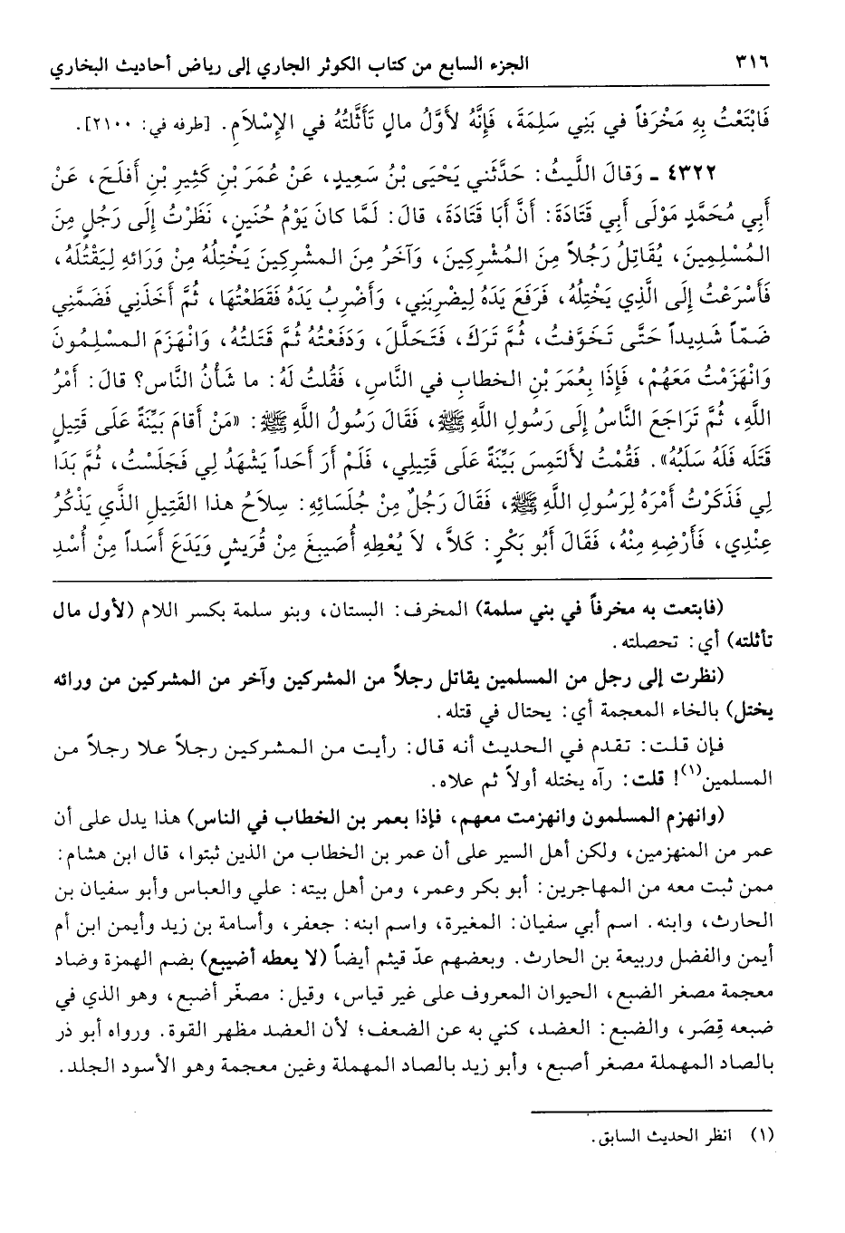 4322 - وَقَالَ اللَّيْثُ حَدَّثَنِى يَحْيَى بْنُ سَعِيدٍ عَنْ عُمَرَ بْنِ كَثِيرِ بْنِ أَفْلَحَ عَنْ أَبِى مُحَمَّدٍ مَوْلَى أَبِى قَتَادَةَ أَنَّ أَبَا قَتَادَةَ قَالَ لَمَّا كَانَ يَوْمُ حُنَيْنٍ نَظَرْتُ إِلَى رَجُلٍ مِنَ الْمُسْلِمِينَ يُقَاتِلُ رَجُلاً مِنَ الْمُشْرِكِينَ، وَآخَرُ مِنَ الْمُشْرِكِينَ يَخْتِلُهُ مِنْ وَرَائِهِ لِيَقْتُلَهُ، فَأَسْرَعْتُ إِلَى الَّذِى يَخْتِلُهُ فَرَفَعَ يَدَهُ لِيَضْرِبَنِى، وَأَضْرِبُ يَدَهُ، فَقَطَعْتُهَا، ثُمَّ أَخَذَنِى، فَضَمَّنِى ضَمًّا شَدِيدًا حَتَّى تَخَوَّفْتُ، ثُمَّ تَرَكَ فَتَحَلَّلَ، وَدَفَعْتُهُ ثُمَّ قَتَلْتُهُ، وَانْهَزَمَ الْمُسْلِمُونَ، وَانْهَزَمْتُ مَعَهُمْ، فَإِذَا بِعُمَرَ بْنِ الْخَطَّابِ فِي النَّاسِ، فَقُلْتُ لَهُ مَا شَأْنُ النَّاسِ قَالَ أَمْرُ اللَّهِ، ثُمَّ تَرَاجَعَ النَّاسُ إِلَى رَسُولِ اللَّهِ - صلى الله عليه وسلم - فَقَالَ رَسُولُ اللَّهِ - صلى الله عليه وسلم - «مَنْ أَقَامَ بَيِّنَةً عَلَى قَتِيلٍ قَتَلَهُ فَلَهُ سَلَبُهُ». فَقُمْتُ لأَلْتَمِسَ بَيِّنَةً عَلَى قَتِيلِى، فَلَمْ أَرَ أَحَدًا يَشْهَدُ لِى فَجَلَسْتُ، ثُمَّ بَدَا لِى، فَذَكَرْتُ أَمْرَهُ لِرَسُولِ اللَّهِ - صلى الله عليه وسلم - فَقَالَ رَجُلٌ مِنْ جُلَسَائِهِ سِلاَحُ هَذَا الْقَتِيلِ الَّذِى يَذْكُرُ عِنْدِى فَأَرْضِهِ مِنْهُ. فَقَالَ أَبُو بَكْرٍ كَلاَّ لاَ يُعْطِهِ أُصَيْبِغَ مِنْ قُرَيْشٍ، وَيَدَعَ أَسَدًا مِنْ أُسْدِ