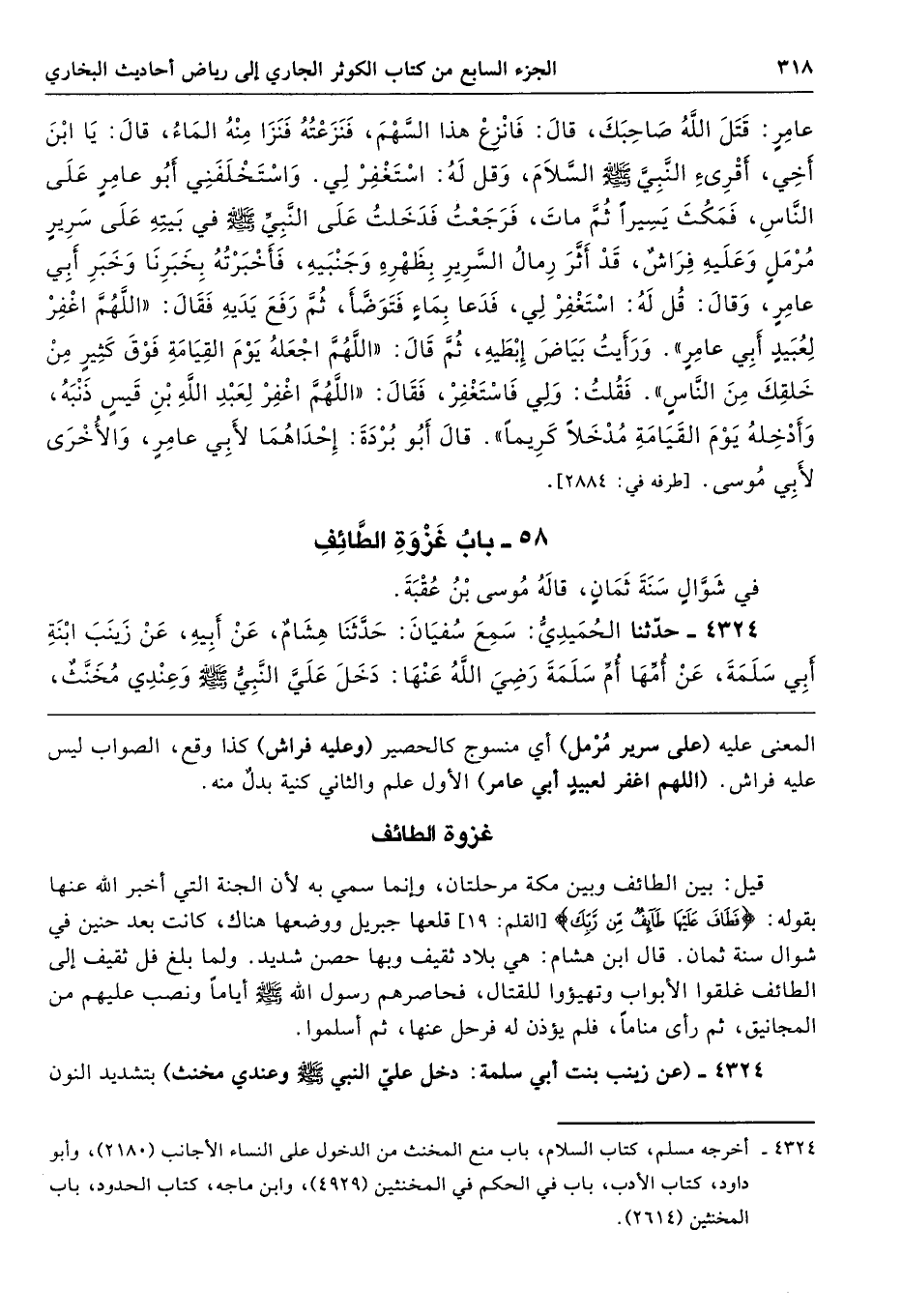 المعنى عليه (على سرير مُرْمل) أي منسوج كالحصير (وعليه فراش) كذا وقع، الصواب ليس عليه فراش. (اللهم اغفر لعبيدٍ أبي عامر) الأوَّل علم والثاني كنية بدلٌ منه.