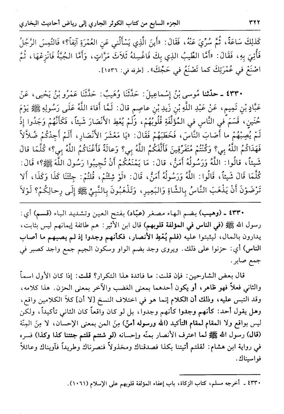 4330 - (وهيب) بضم الهاء مصغر (عبّاد) بفتح العين وتشديد الباء (قسم) أي: رسول الله - صلى الله عليه وسلم - (في الناس في المؤلفة قلوبهم) قال ابن الأثير: هم طائفة إيمانهم ليس بثابت، يدارون بالمال، ليثبتوا عليه (فلم يُعْطِ الأنصار، فكأنهم وجدوا إذ لم يصبهم ما أصاب الناس) أي: حزنوا على ذلك. ويروى وجد بضم الواو وسكون الجيم جمع واجد كصبر في جمع صابر.